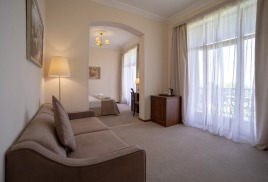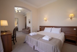 - Джуниор Сюит комфорт. Просторный номер с высокими потолками площадью 28-30 кв.м., состоящий из прихожей, большой ванной комнаты и жилой зоны свободной планировки с неизолированными друг от друга спальней с двуспальной кроватью (160Х200 см) и гостиной, одним или двумя балконами с мебелью. В каждом номере есть система кондиционирования, телевизор, холодильник. С балкона открывается великолепный вид на море или вечнозеленый парк. Номер идеально подходит как для семейного отдыха с ребенком, так и для романтического путешествия.