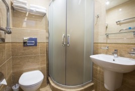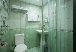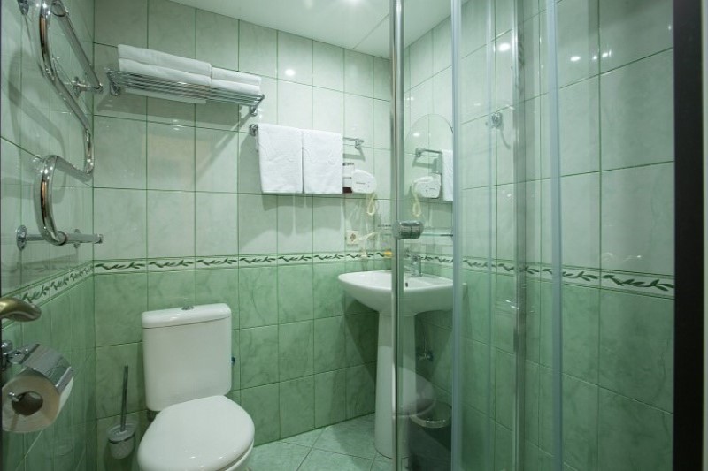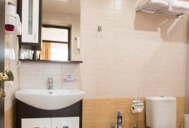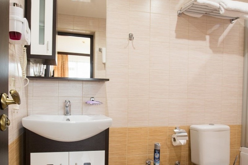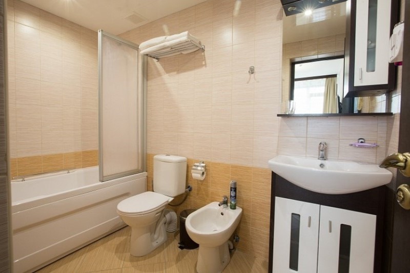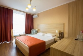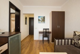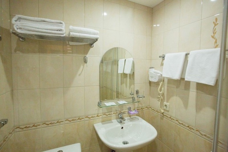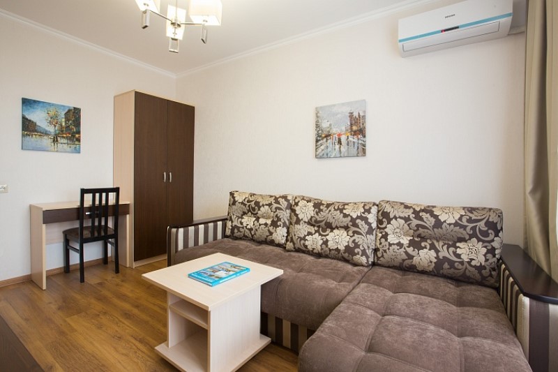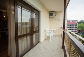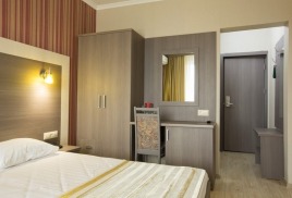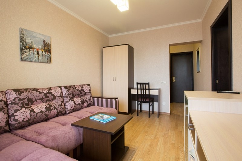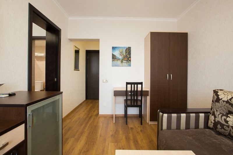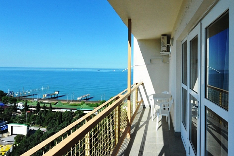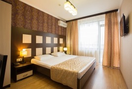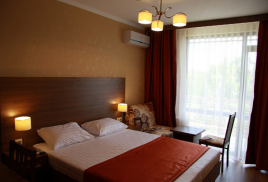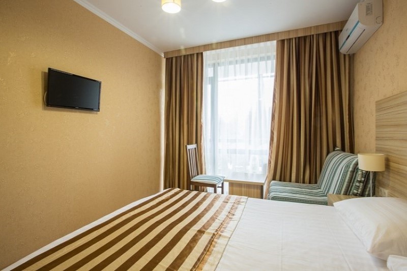 1-но местный Комфорт. Площадь - 16м². В номере: двухспальная кровать, телевизор, кондиционер, холодильник, прикроватные тумбочки, шкаф, сейф, журнальный столик, кресло-кровать, стандартный набор посуды. В ванной комнате: душевая кабина, раковина, унитаз, полотенцесушитель, фен. Балкон: все номера с балконами, имеется вид на море и горы. На балконе удобный пляжный столик и стулья, настенная сушилка для белья.