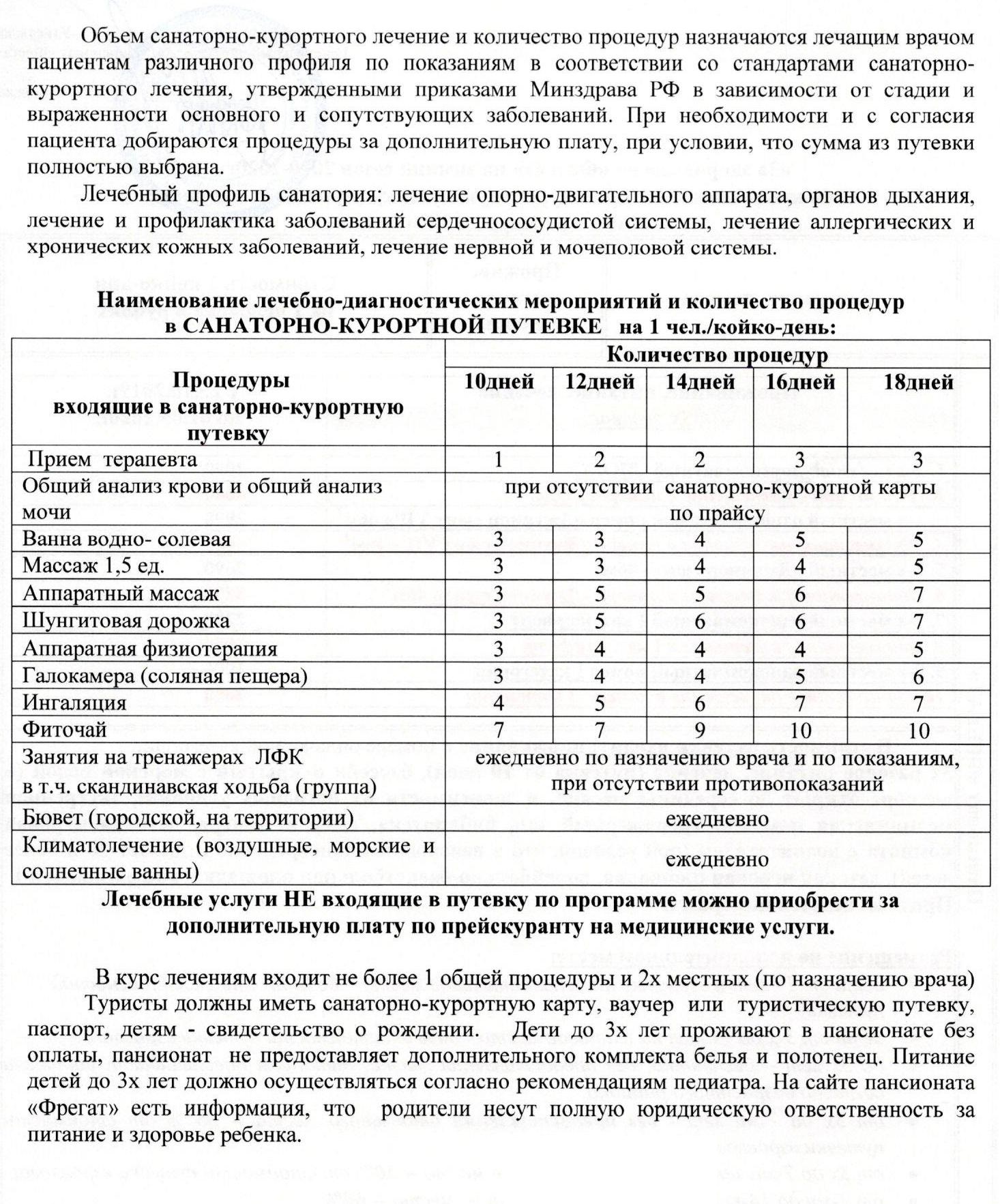 Медицинские процедуры предоставляются при бронировании от 7 дней на базе пансионата (БЕЗ МАЦЕСТЫ) при бронировании меньшего количества дней медицинские процедуры не назначаются.