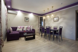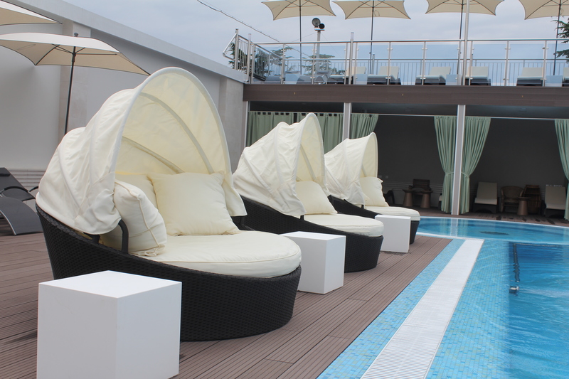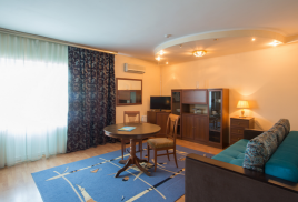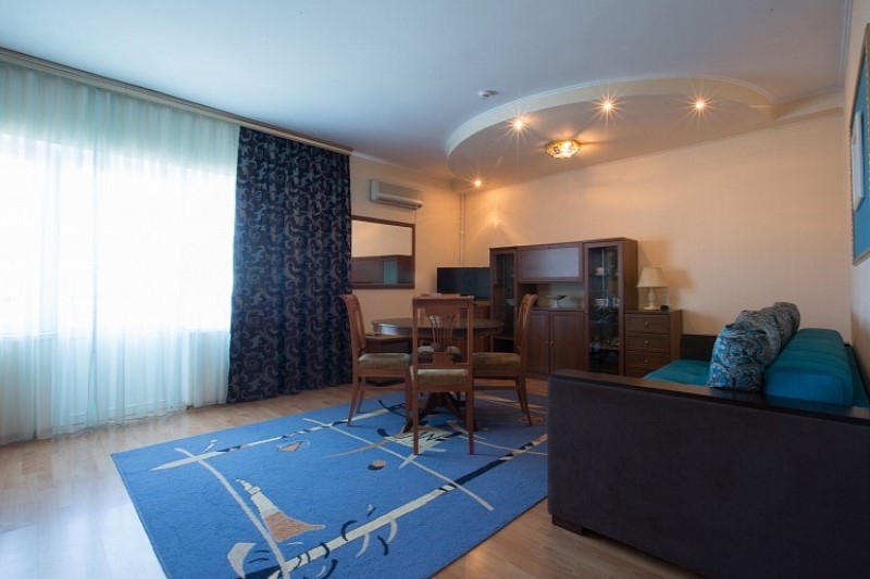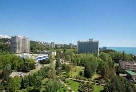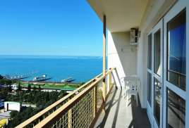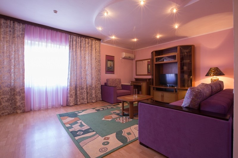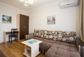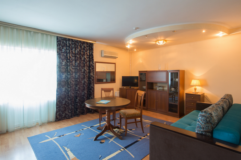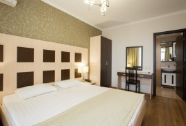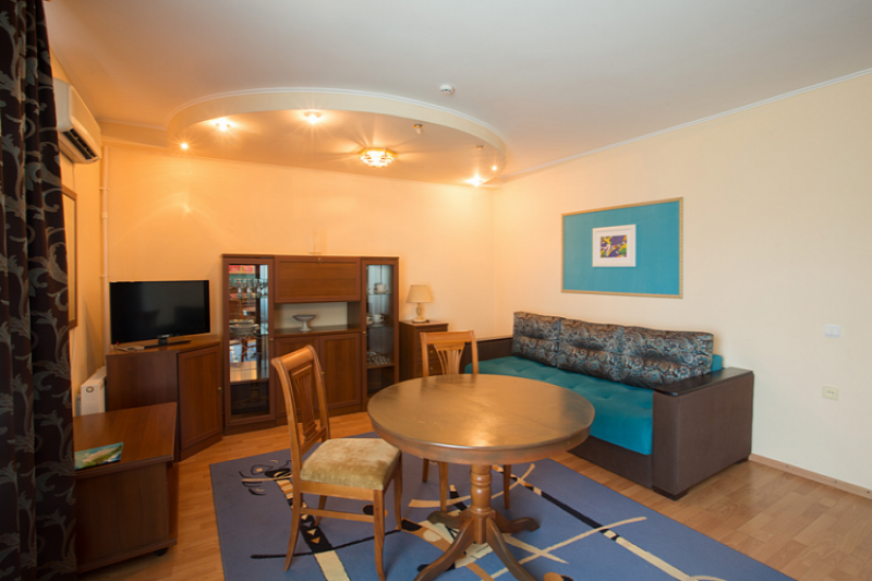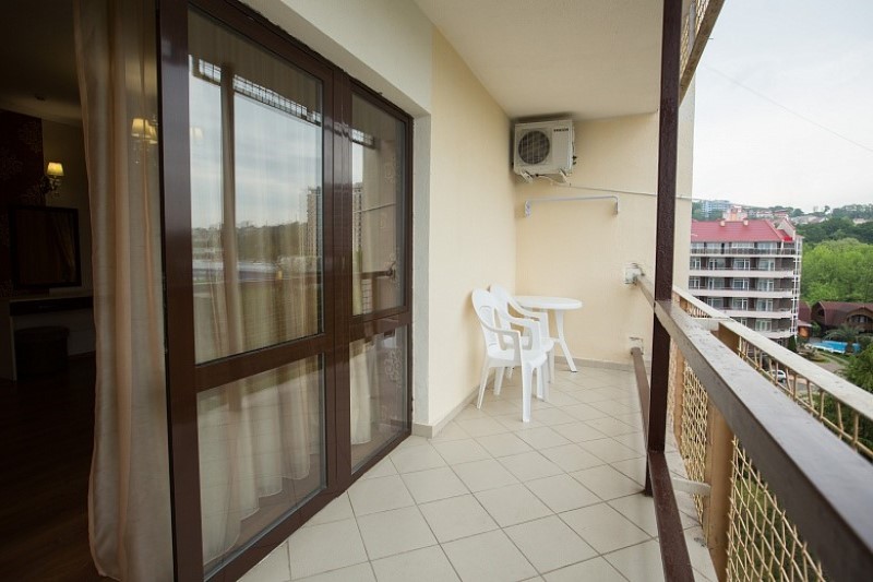 2-х местный 1-но комнатный Джуниор Сьют. Совмещенная спальня и гостиная. Площадь - 46 м². В номере: двуспальная кровать, прикроватные тумбочки, мягкая мебель, журнальный столик, кондиционер, телевизор, холодильник, фен, сейф, электрочайник и чайные принадлежности, набор посуда, ванная комната с душем и биде, стандартный набор туалетных средств, халат и тапочки. Дополнительное место – раскладной диван. Балкон: большой балкон с прекрасным видом на море и декоративный бассейн автора З. Церителли. На балконе пластиковый стол и стулья, настенная сушилка для белья.