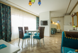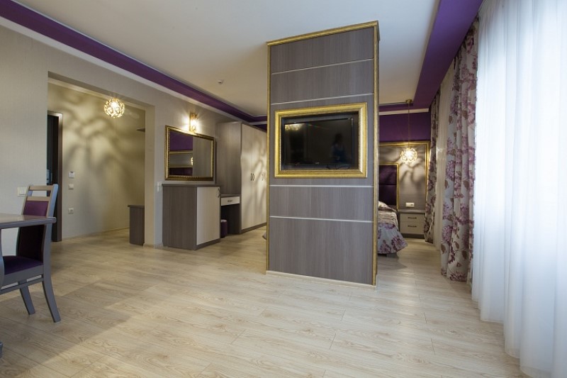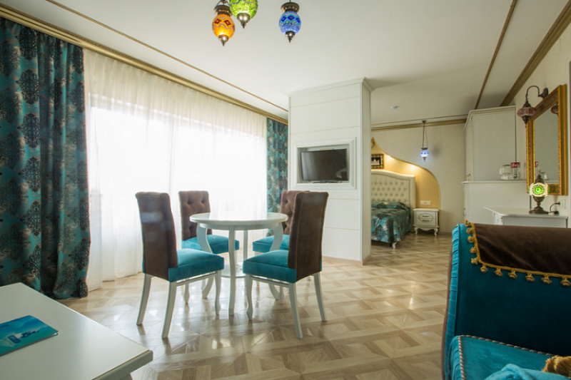 2-х местный 1-но комнатный Джуниор Сьют VIP. Совмещенная спальня и гостиная. Площадь - 46 м². В номере: двуспальная кровать, прикроватные тумбочки, мягкая мебель, журнальный столик, кондиционер, телевизор, холодильник, фен, сейф, электрочайник и чайные принадлежности, набор посуда, халат и тапочки. Дополнительное место – раскладной диван. В ванной комнате: Полный с/у - ванна, раковина, биде, туалет, стандартный набор туалетных средств. Неполный с/у — раковина, туалет. Балкон: все номера с балконами, имеется вид на море и горы. На балконе удобный пляжный столик и стулья, настенная сушилка для белья.