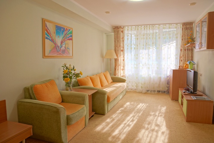 Люкс двухкомнатный двухместный без террасы: двухкомнатный люкс с гостинной, спальней, ванной, туалетом и открытым балконом,Телевизор, Холодильник, Кондиционер, Телефон, Фен, душевая кабин, Унитаз, Джакузи