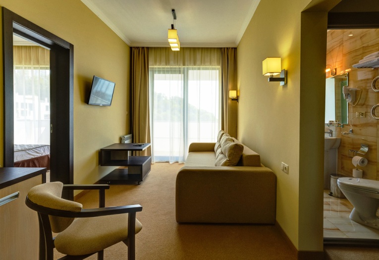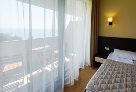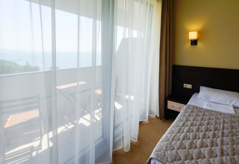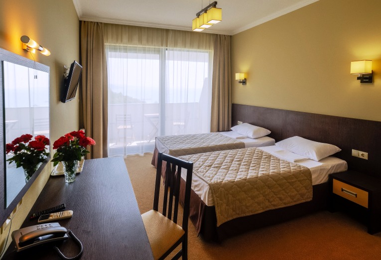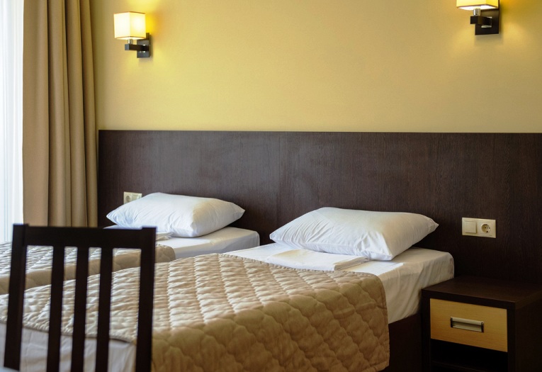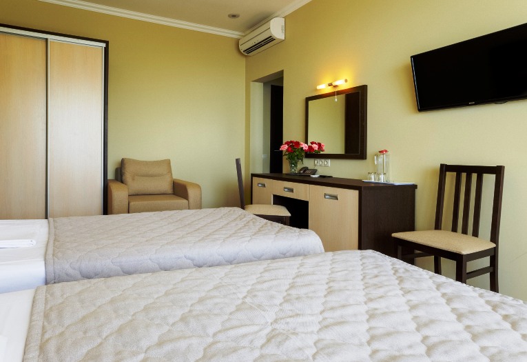 - 2-х местный 1 категории: двухместный однокомнатный номер площадью 18,6 м2. Все номера данной категории с балконами и видом на море. В номере: две 1,5 спальные кровати, шкаф, туалетный столик с зеркалом, кондиционер, телевизор, холодильник, санузел с душевой кабиной.