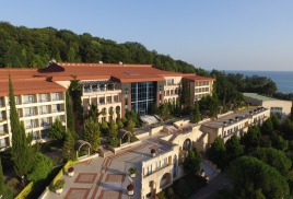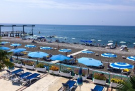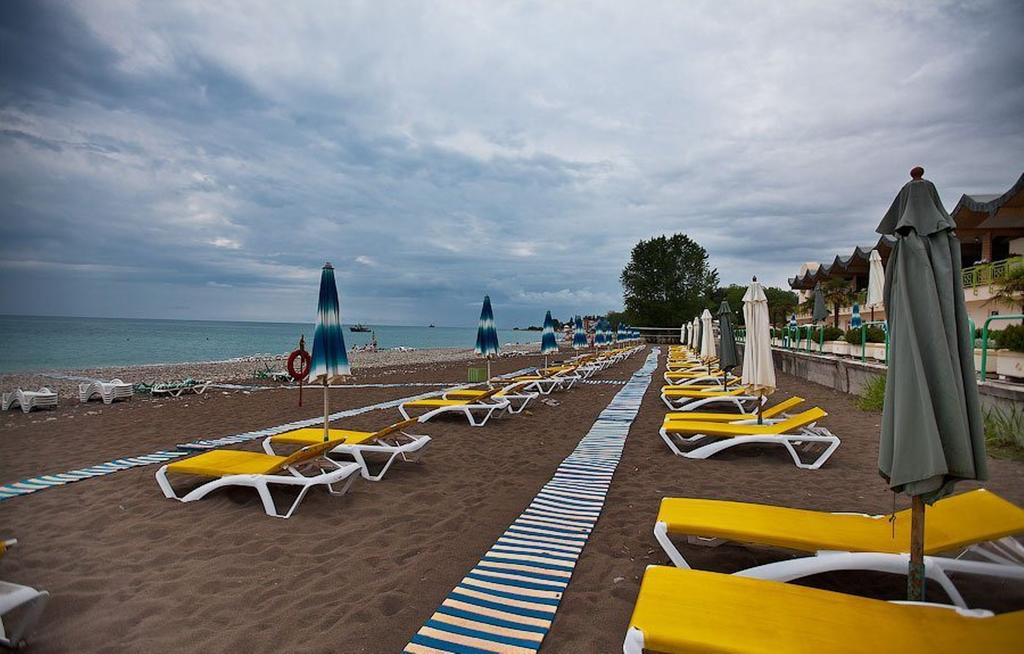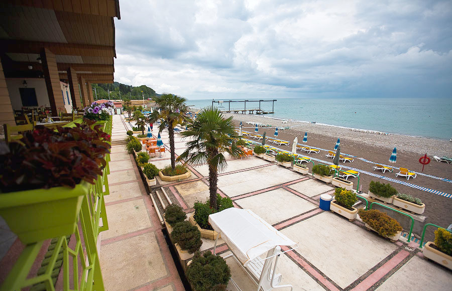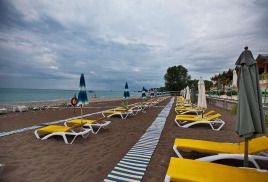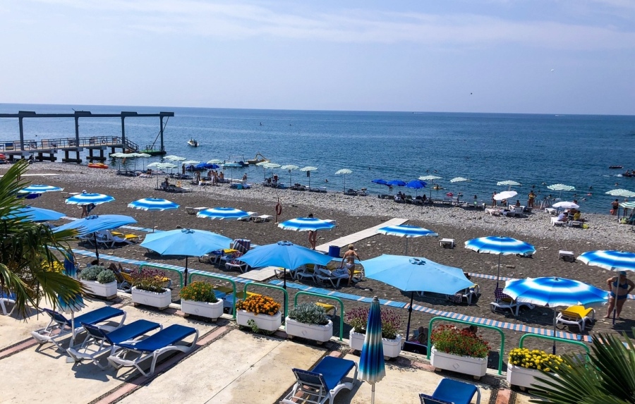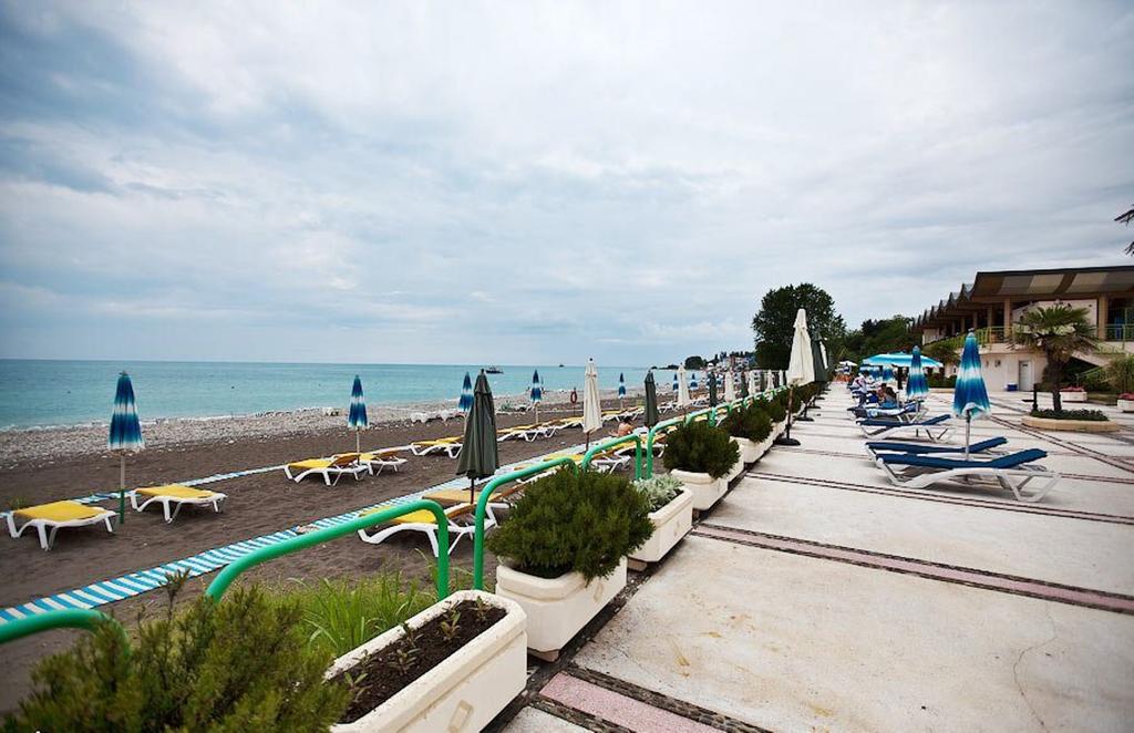 Пляж: собственный галечный, расстояние до моря 300 м. К морю можно пройти пешком или доехать на микроавтобусе, который регулярно курсирует от главного входа санатория. Побережье разделено на две широкие полосы, одна из которых покрыта крупной галькой, а другая — песком.