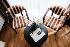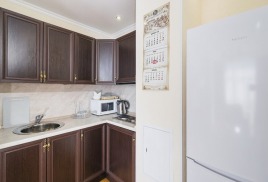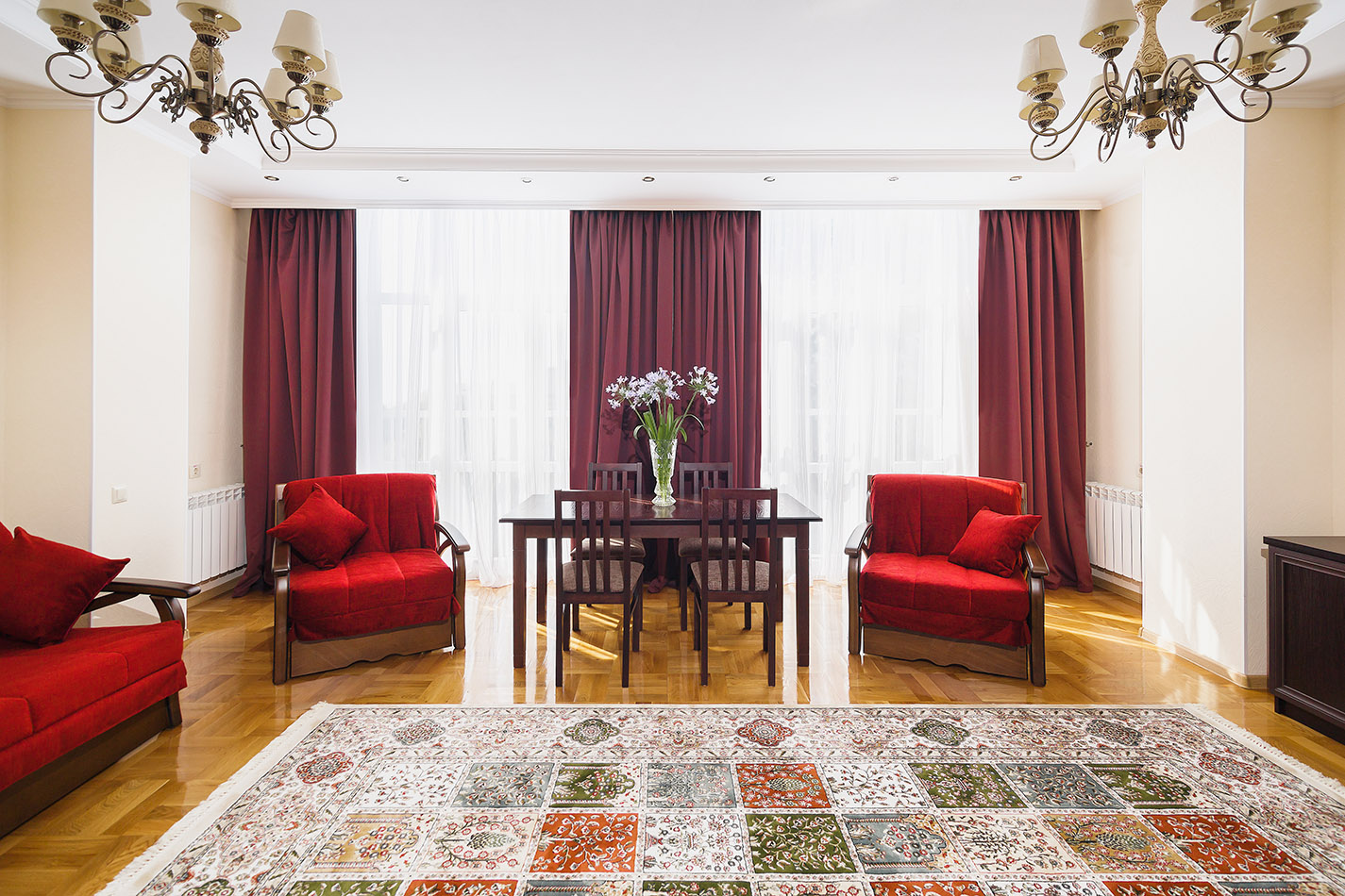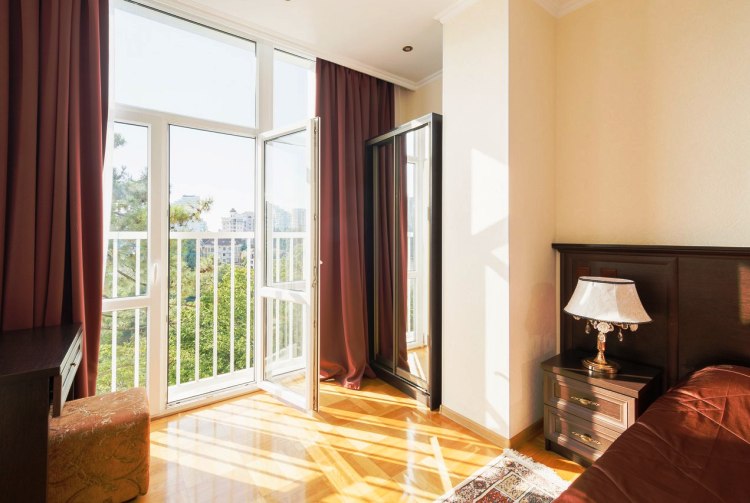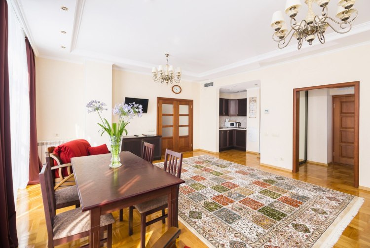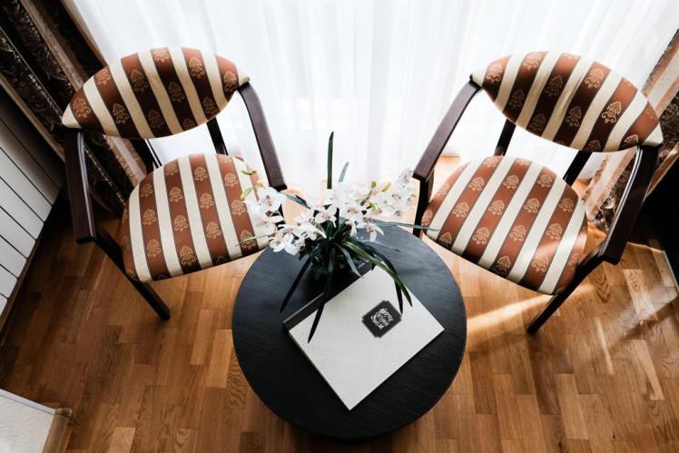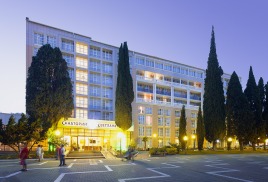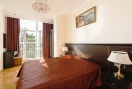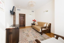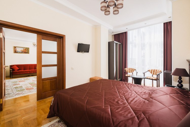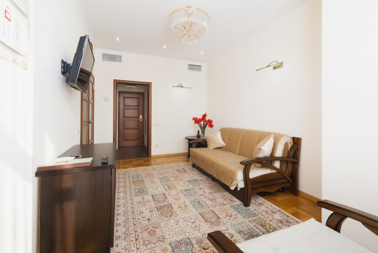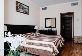 - 2-х местный 2-х комнатный люкс. Площадь номера, кв.м: 50. В спальне: двуспальная кровать, прикроватные тумбочки с настольными светильниками, телевизор, зона отдыха с креслами и журнальным столиком, туалетный столик с зеркалом. В гостиной: современная мягкая мебель (диван раскладывается в дополнительное спальное место), телевизор, кухонный уголок с холодильником, электрочайником, электроплитой, микроволновой печью, раковиной, набором посуды. В санузле: ванна, фен, полотенцесушитель, туалетные принадлежности, пляжные полотенца. В номере есть шкаф-купе, сейф, гладильная доска, сушилка для белья, кондиционер, телефон с внутренней связью и Wi-Fi.