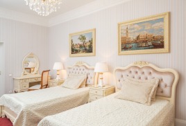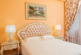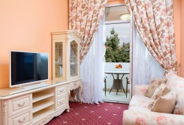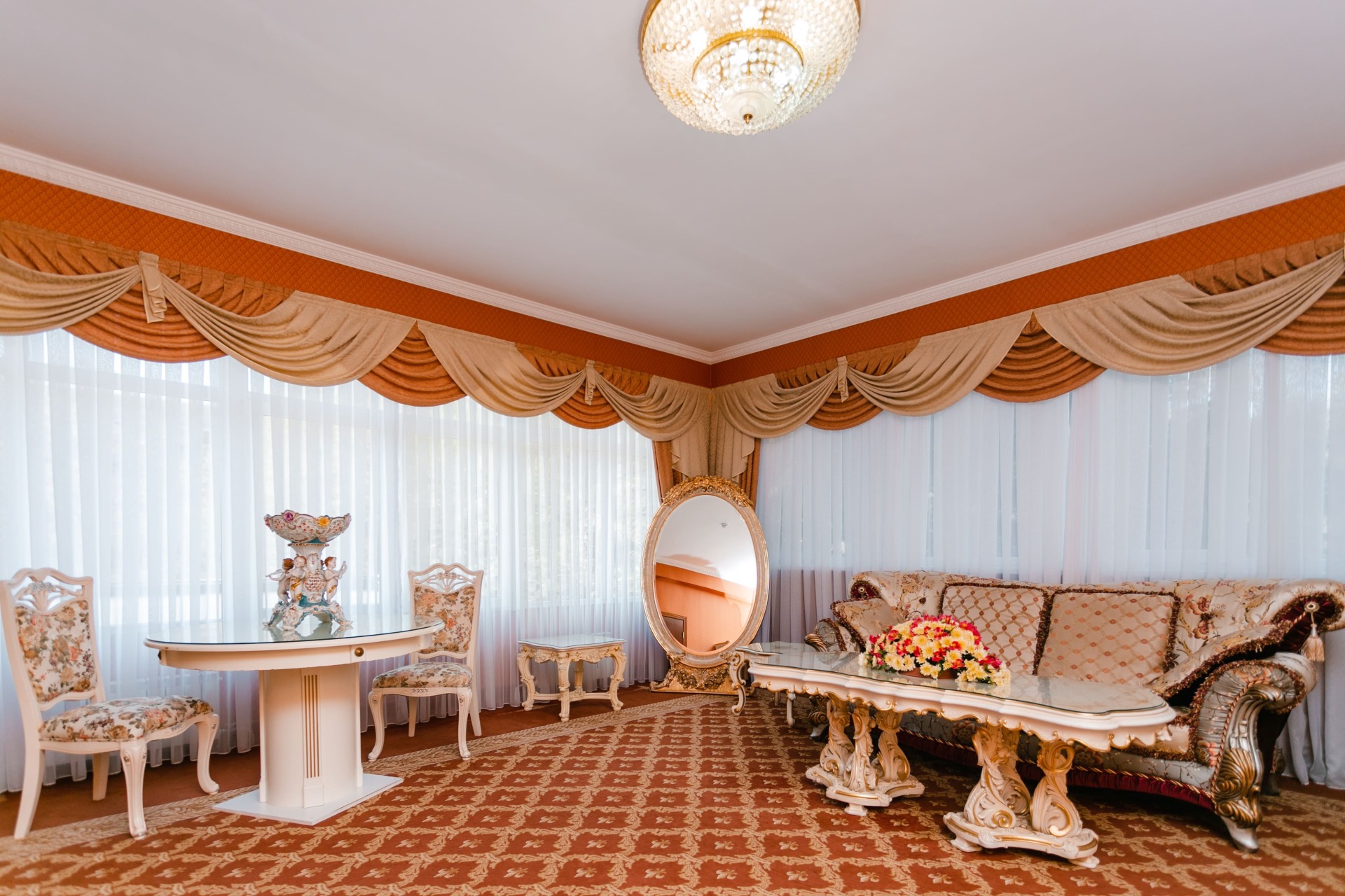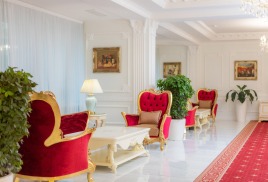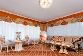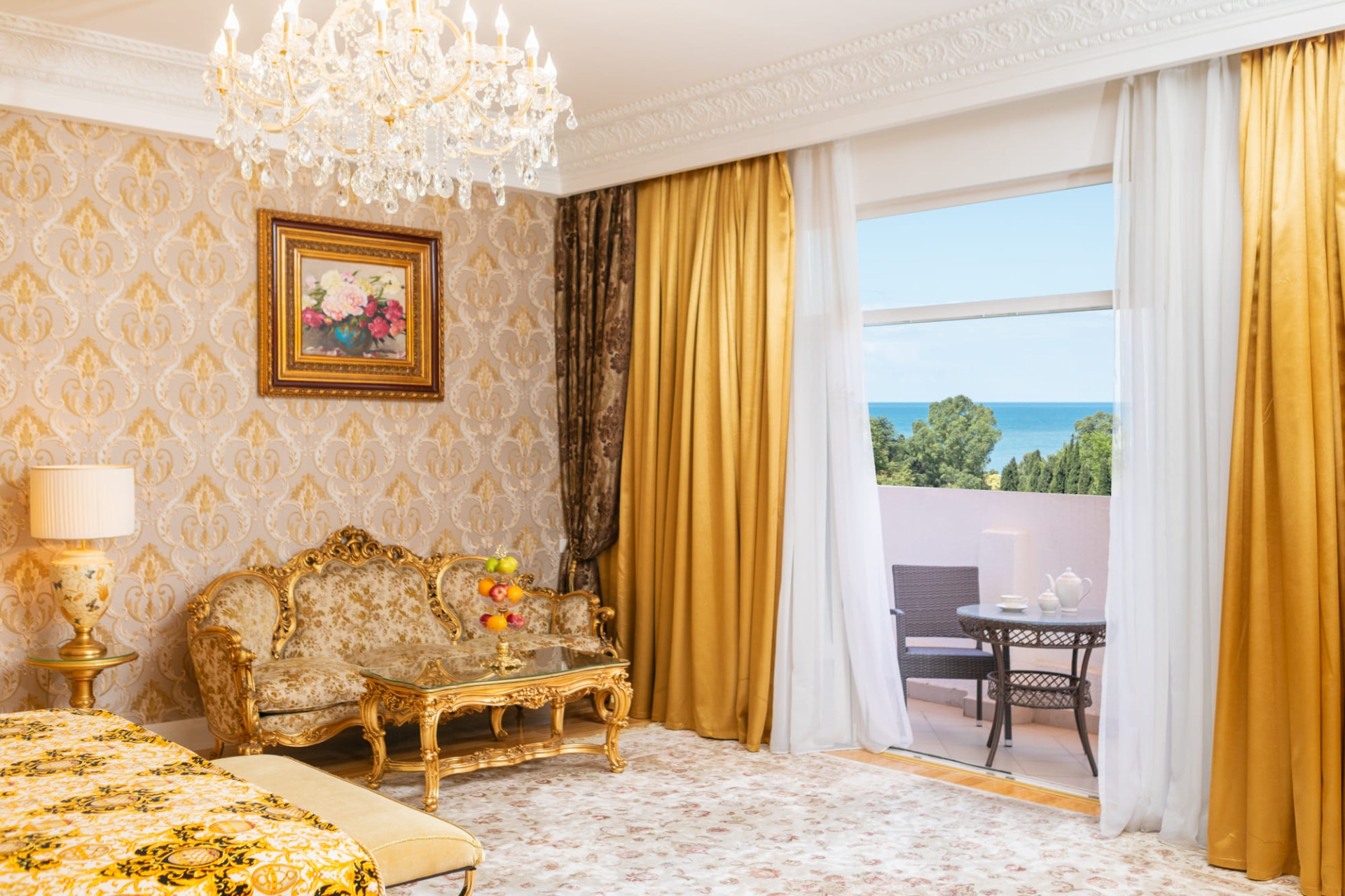 - Люкс. Двухместный двухкомнатный номер, рассчитан на проживание двух человек. Предусмотрены дополнительные места. Общая площадь от 40 кв.м. Номера оформлены в классическом стиле. В ванной комнате площадью 9 кв.м. унитаз, биде, раковина, джакузи или ванна, душевая кабина. В номерах: корпусная и мягкая мебель, система кондиционирования, холодильник, телевизор, спутниковые и эфирные каналы телевидения, телефон, Wi-Fi (бесплатный доступ в интернет), сейф, мини-бар, набор посуды, фен. На балконе: ротанговая мебель, шезлонги. Питание осуществляется в "Красном" и "Коралловом" залах.