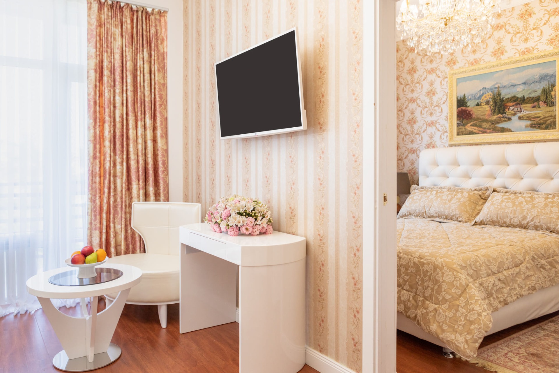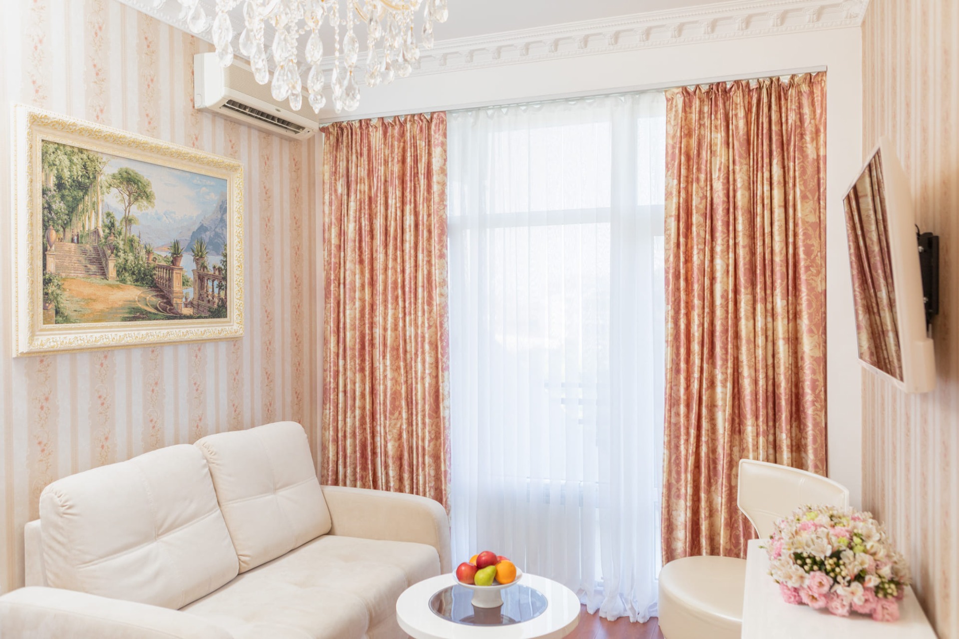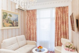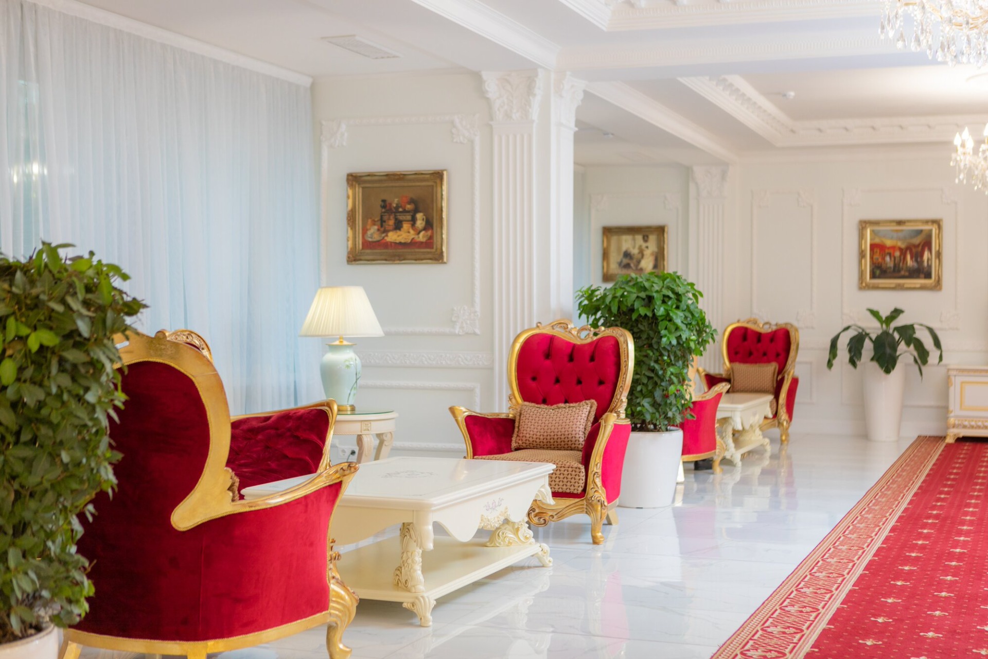 - Люкс. Двухместный двухкомнатный номер, рассчитан на проживание двух человек. Предусмотрены дополнительные места. Общая площадь от 40 кв.м. Номера оформлены в классическом стиле. В ванной комнате площадью 9 кв.м. унитаз, биде, раковина, джакузи или ванна, душевая кабина. В номерах: корпусная и мягкая мебель, система кондиционирования, холодильник, телевизор, спутниковые и эфирные каналы телевидения, телефон, Wi-Fi (бесплатный доступ в интернет), сейф, мини-бар, набор посуды, фен. На балконе: ротанговая мебель, шезлонги. Питание осуществляется в "Красном" и "Коралловом" залах.