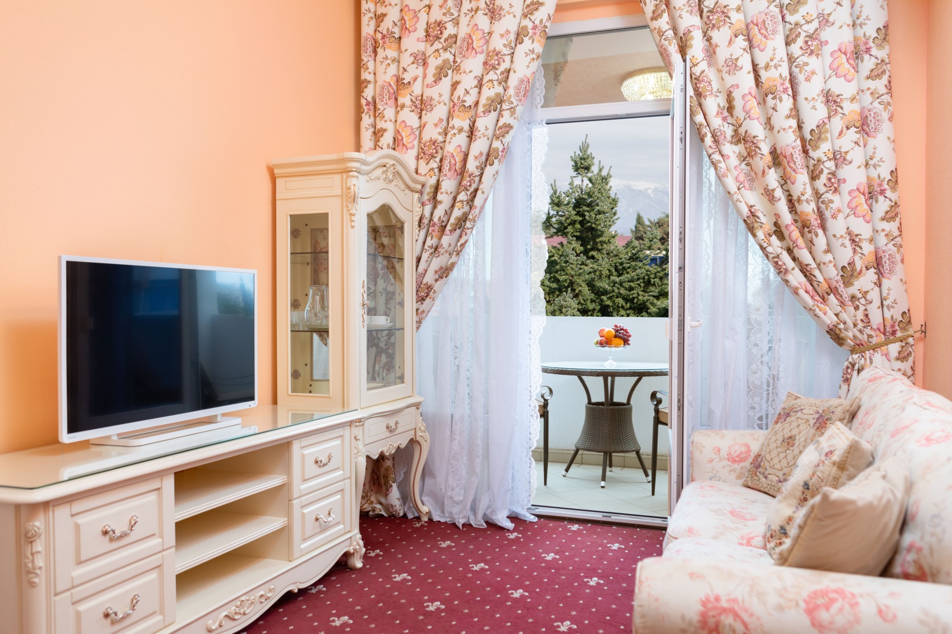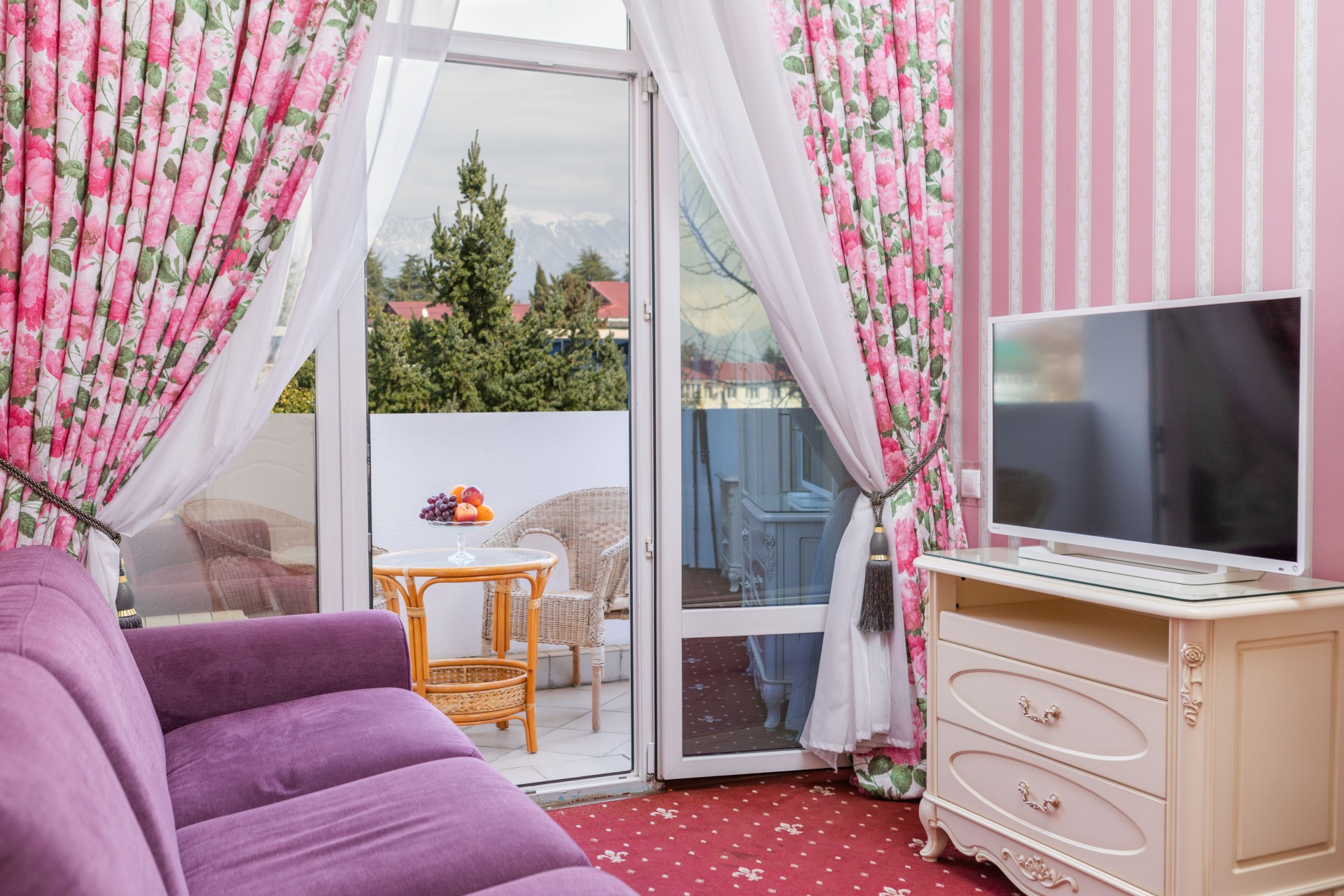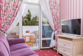 - Стандарт повышенной комфортности двухместный двухкомнатный. Двухместные двухкомнатные номера представлены во втором, третьем и четвертом корпусах. Общая площадь от 35 кв. м. Номера рассчитаны на проживание одного или двух человек, предусмотрены дополнительные места (кресло кровать или диван). Состоят из спальни и гостиной комнат и санузла (с душем или ванной). В номерах: корпусная и мягкая мебель, кондиционер, холодильник, телевизор, спутниковые и эфирные каналы телевидения, телефон, Wi-Fi (бесплатный доступ в интернет). На балконе: ротанговая мебель. Питание осуществляется в «Золотом» и «Розовом» залах