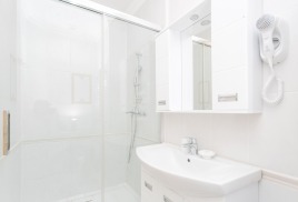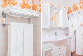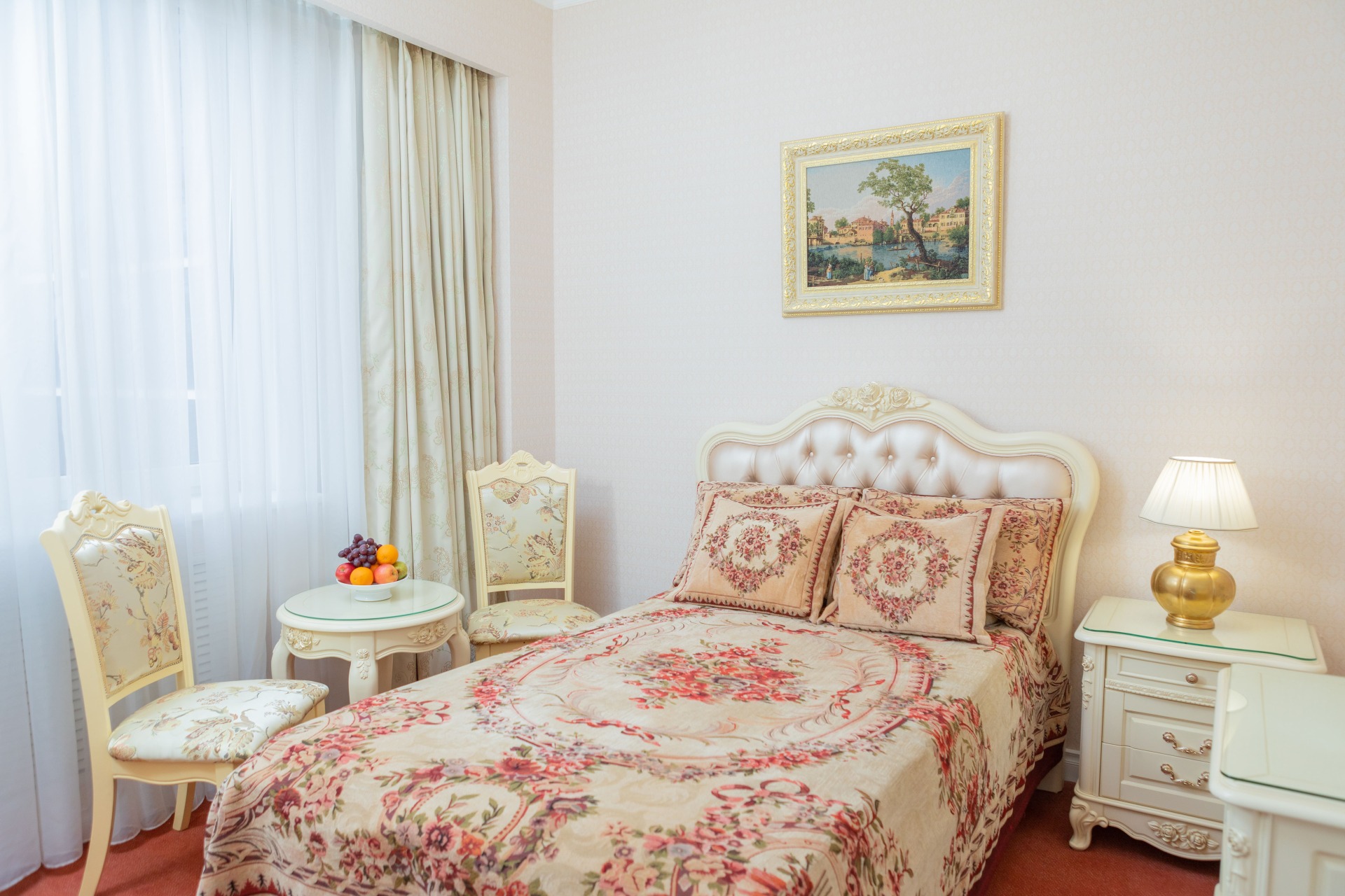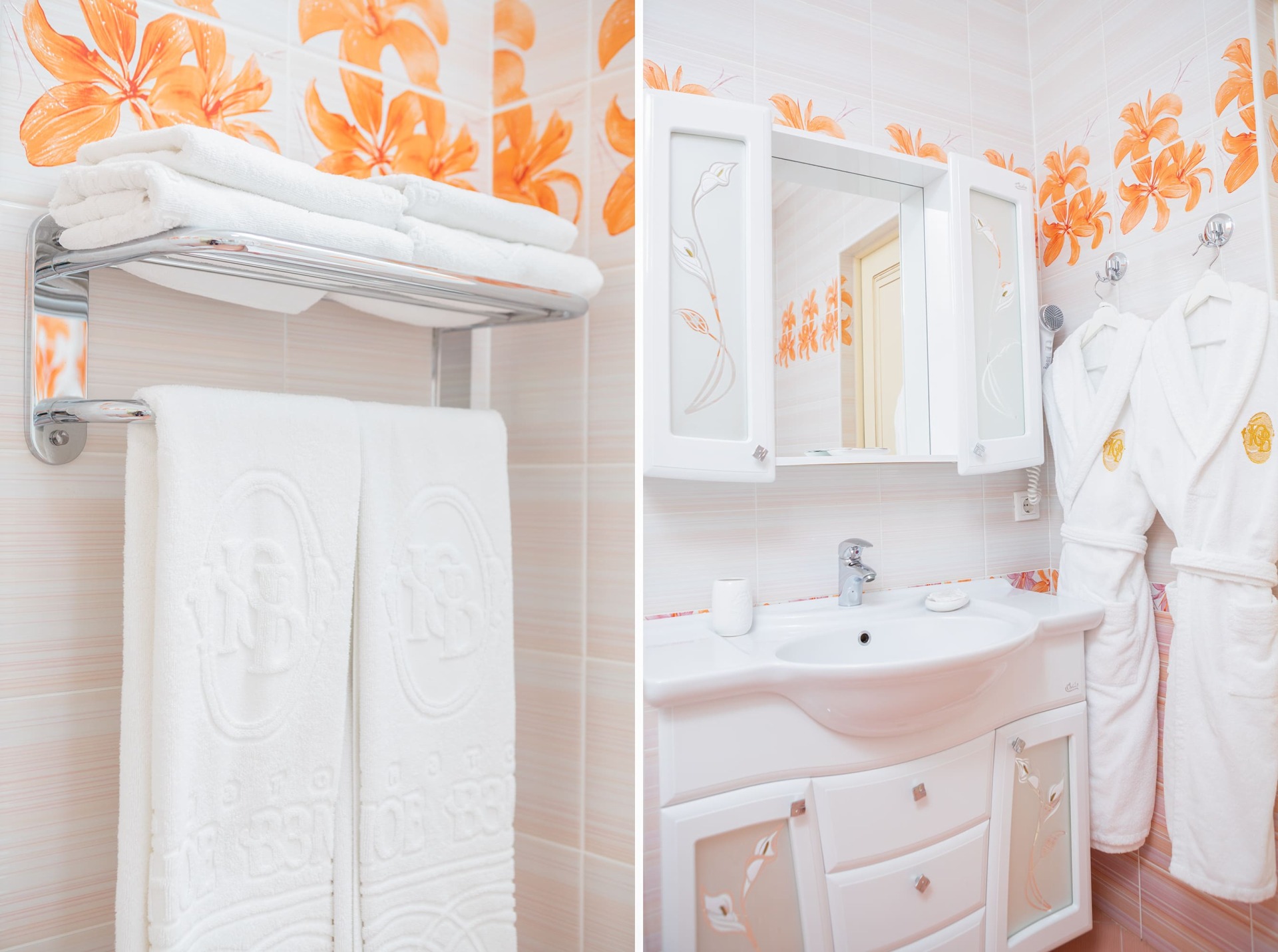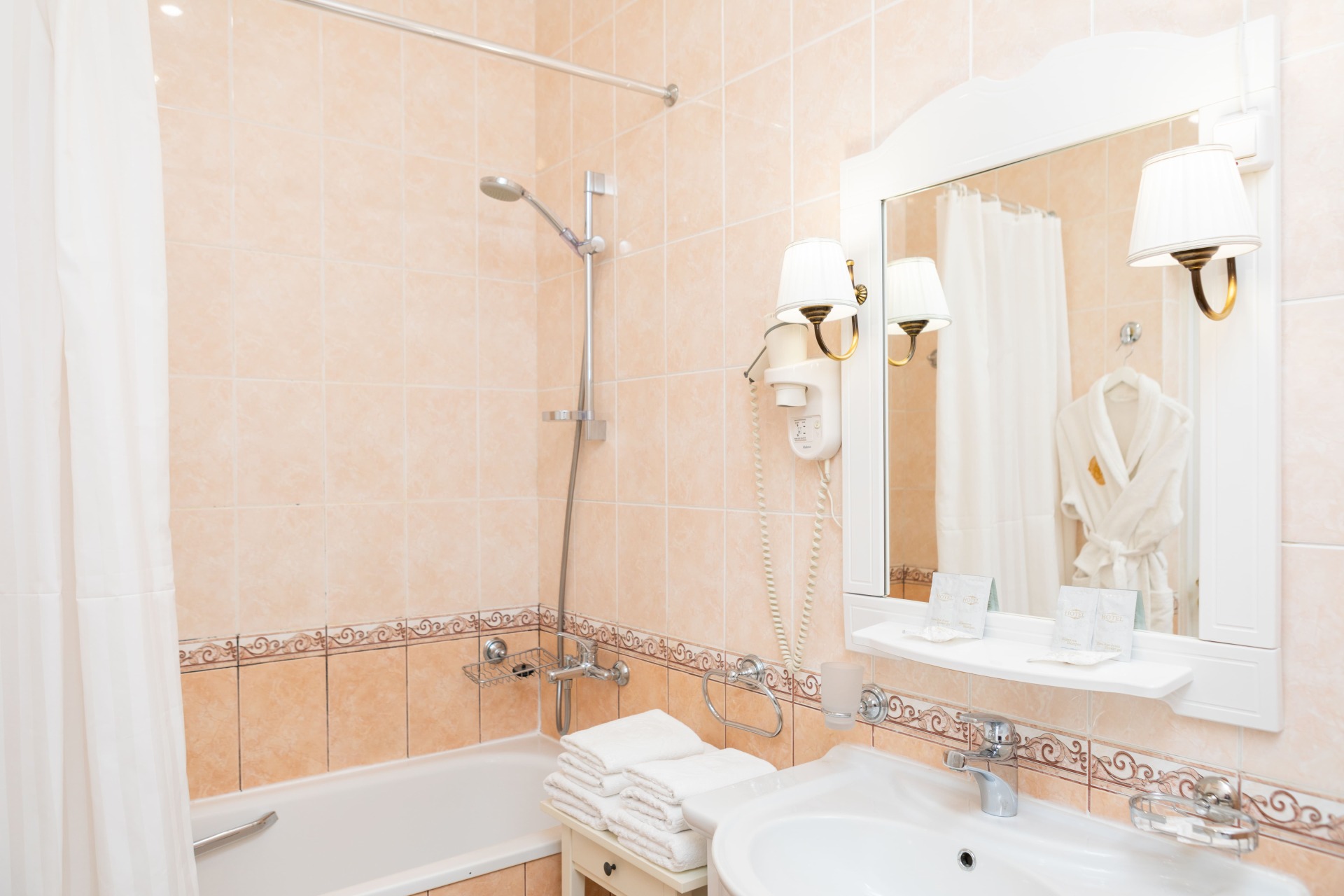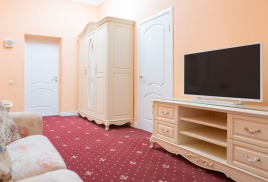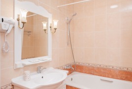 - Стандарт повышенной комфортности одноместный. Одноместные однокомнатные номера представлены в третьем корпусе. Общая площадь от 9 кв. м. Дополнительного места нет. Состоят из спальни и санузла (с душем). В номерах: корпусная и мягкая мебель, кондиционер, холодильник, телевизор, спутниковые и эфирные каналы телевидения, телефон, Wi-Fi (бесплатный доступ в интернет). Питание осуществляется в «Золотом» и «Розовом» залах