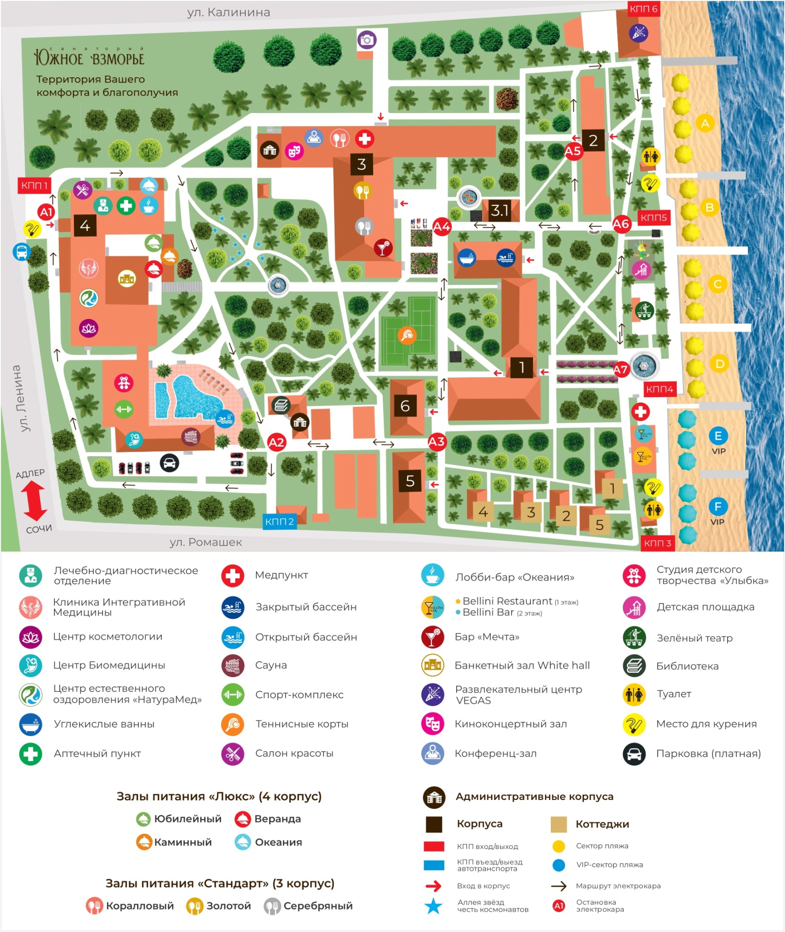 Номерной фонд: На территории санатория «Южное взморье» находятся 7 спальных корпусов. Корпус №1 - 4-этажный с лифтом, корпус №2 - 5-этажный с лифтом, корпус №3 - 7-этажный с лифтом, корпус №1 - 3-этажный без лифта, корпус №4 - 8ми этажный с лифтом (соединен с лечебной базой), корпус №5,6 - 3-этажные без лифта.