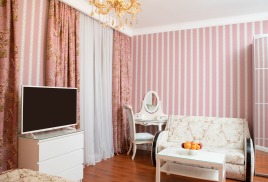 - Стандарт повышенной комфортности двухместный однокомнатный. Двухместные однокомнатные номера представлены в первом, третьем, четвертом и пятом корпусах. Общая площадь от 25 кв. м. Номера рассчитаны на проживание одного или двух человек, предусмотрены дополнительные места (кресло-кровать или диван). Состоят из спальни и санузла (с душем или ванной). В номерах: корпусная и мягкая мебель, кондиционер, холодильник, телевизор, спутниковые и эфирные каналы телевидения, телефон, Wi-Fi (бесплатный доступ в интернет). На балконе: ротанговая мебель. Питание осуществляется в «Золотом» и «Розовом» залах