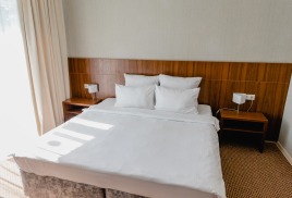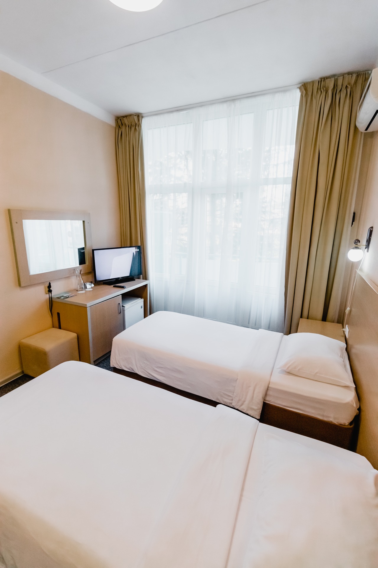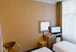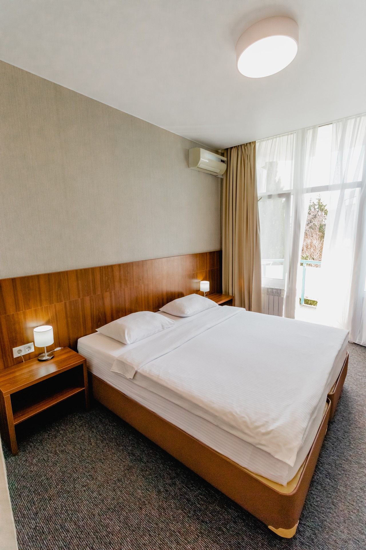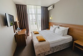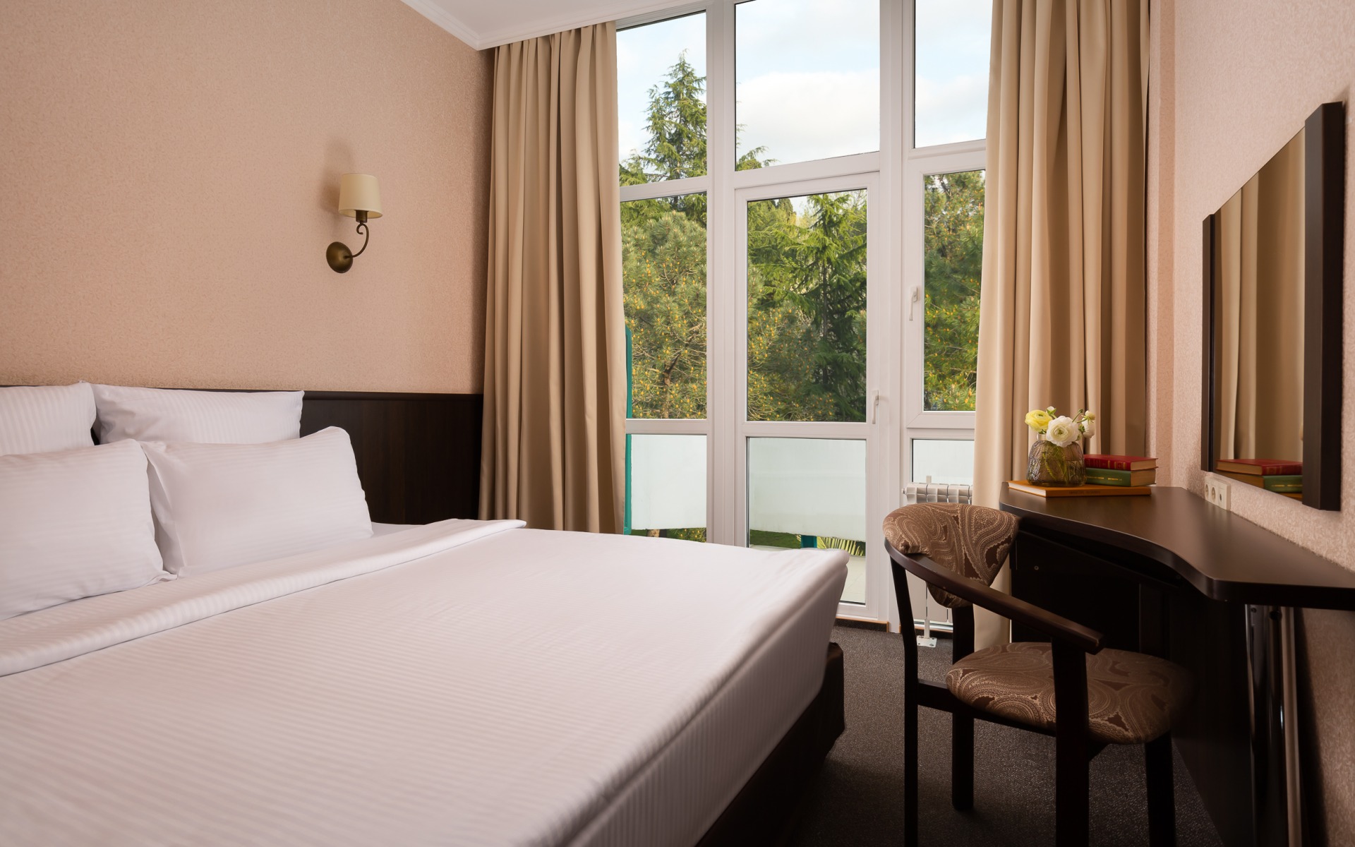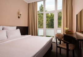 - Комфорт: Вид на парк. Однокомнатный номер площадью 16м² (без площади балкона) с капитальным ремонтом 2012 года. Номера категории Стандарт ПК представлены номерами с двуспальной кроватью 1,8 м или с двумя раздельными кроватями 0,9 м.Оснащён: ЖК телевизор,холодильник,телефон, кондиционер, фен, ванная комната с душем, балкон.