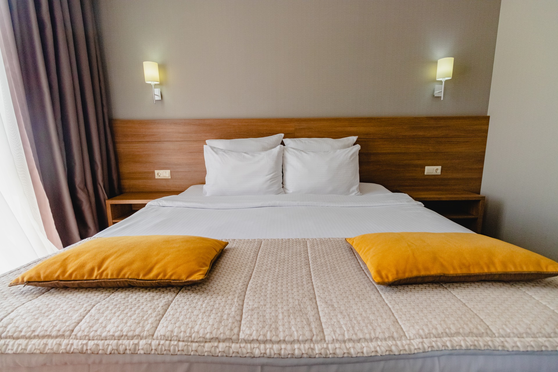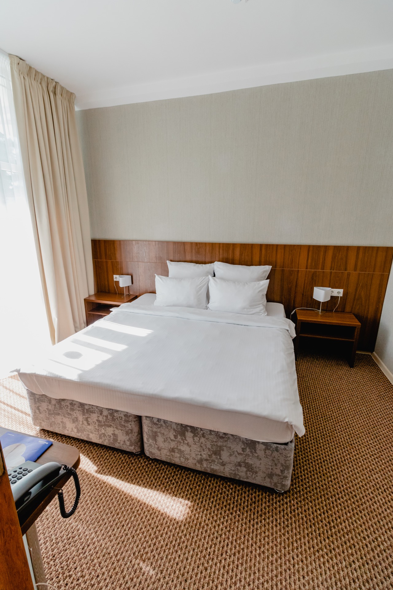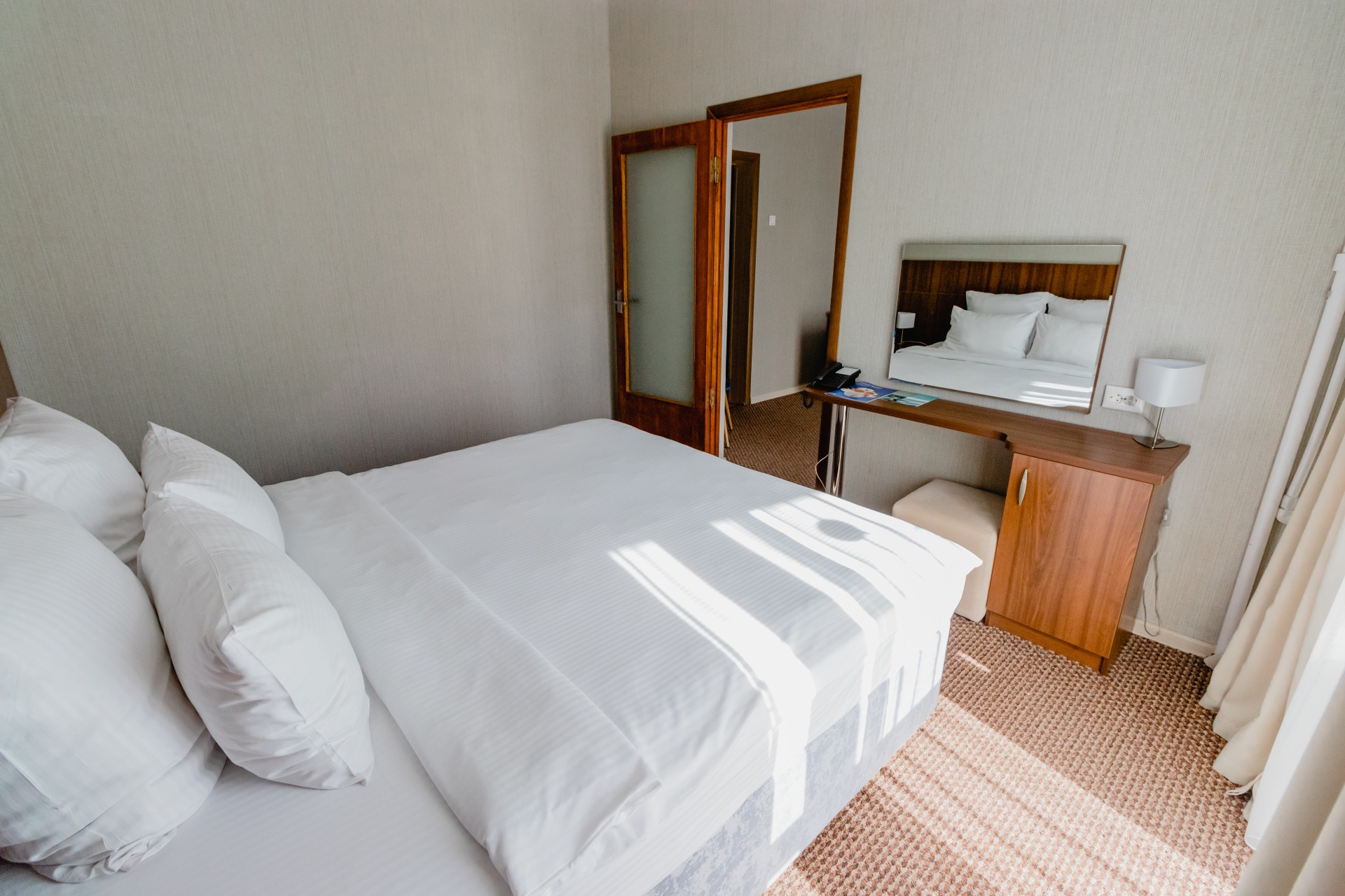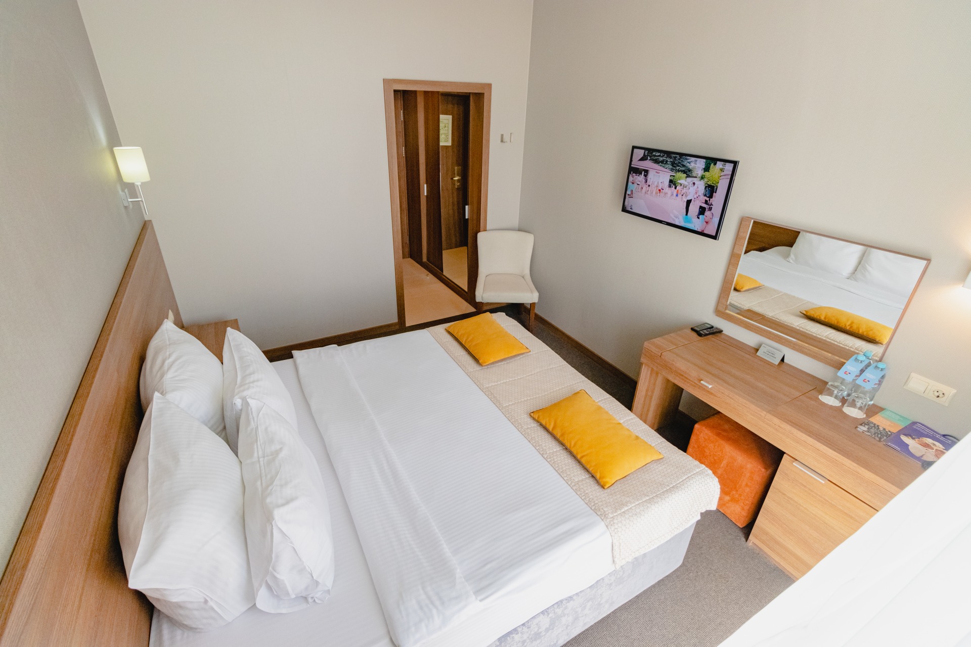 - Комфорт: Вид на парк. Однокомнатный номер площадью 16м² (без площади балкона) с капитальным ремонтом 2012 года. Номера категории Стандарт ПК представлены номерами с двуспальной кроватью 1,8 м или с двумя раздельными кроватями 0,9 м.Оснащён: ЖК телевизор,холодильник,телефон, кондиционер, фен, ванная комната с душем, балкон.