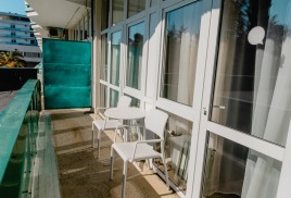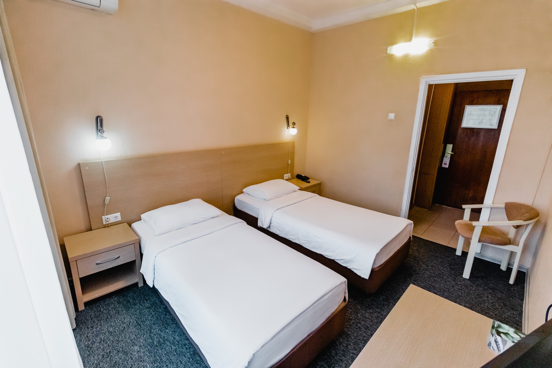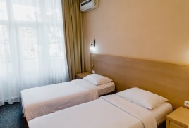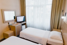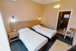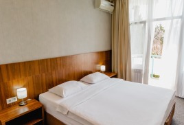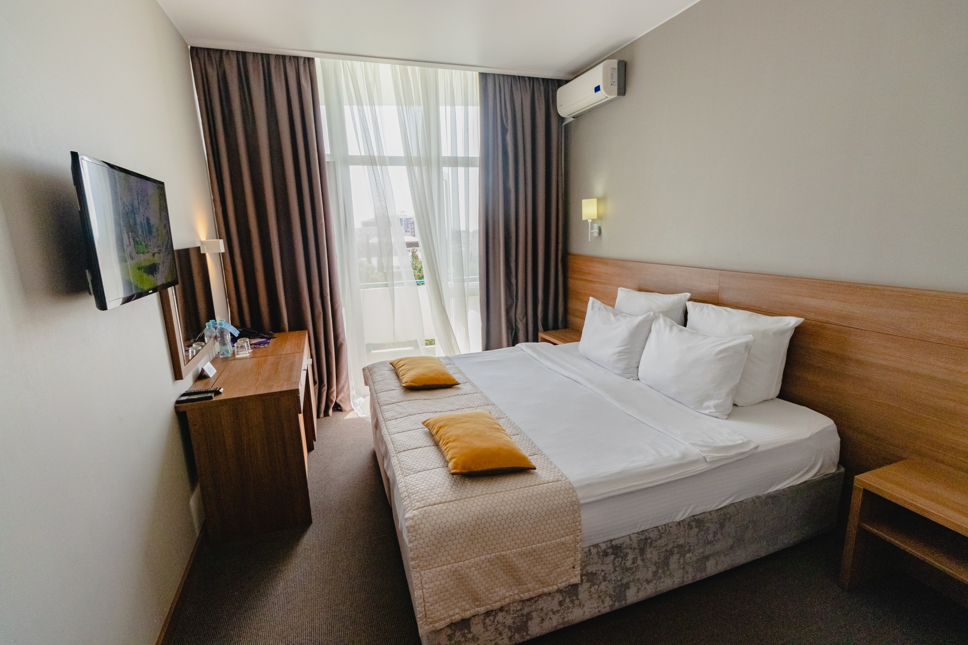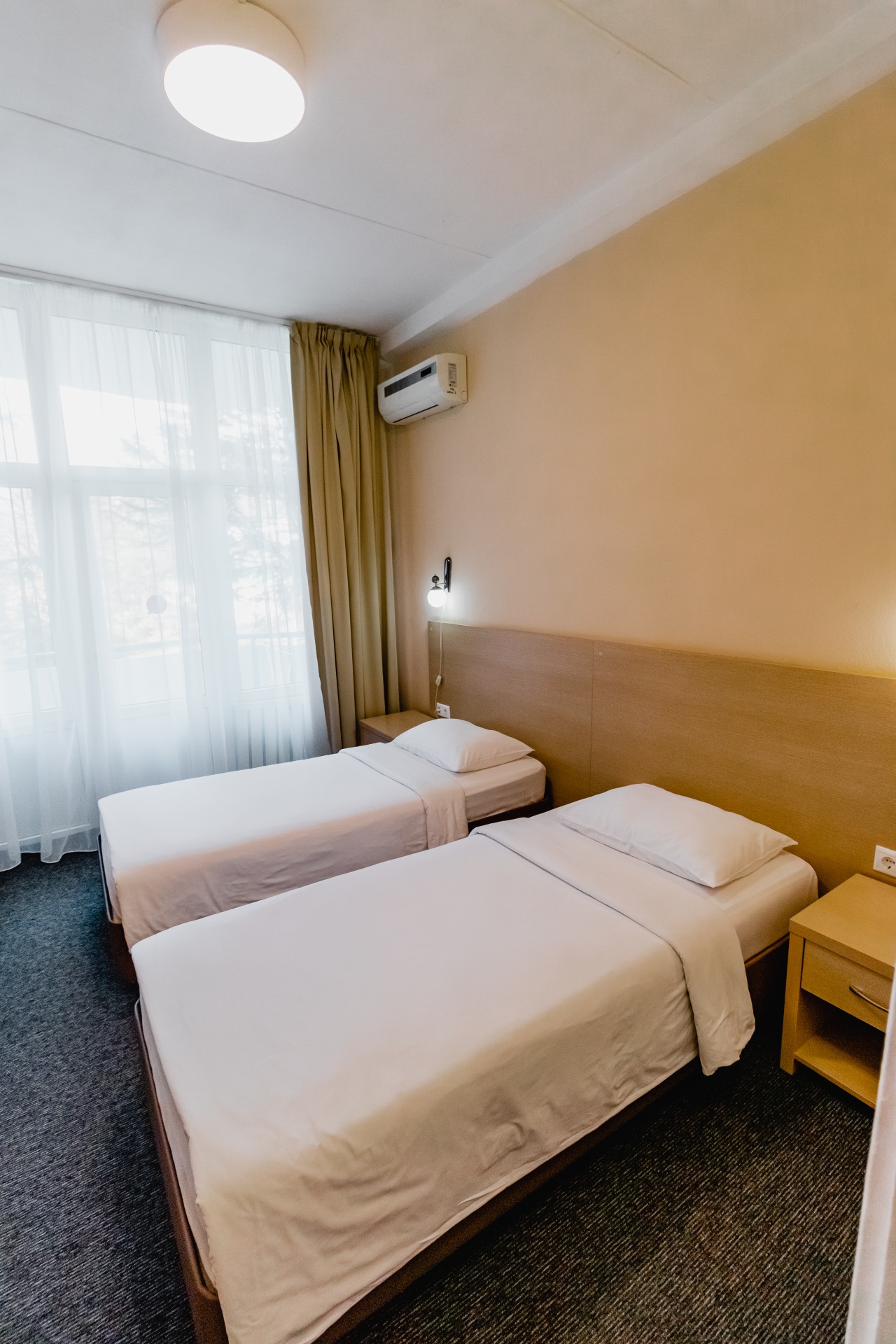 - Стандарт: Вид на парк. однокомнатный номер площадью 16 м² (без площади балкона) с двуспальной кроватью 1,8 м или с двумя раздельными кроватями 0,9 м.Оснащён:телевизор, холодильник,телефон,кондиционер, фен,ванная комната с душем, балкон.