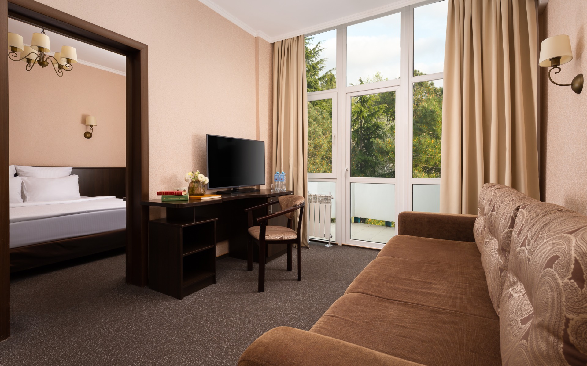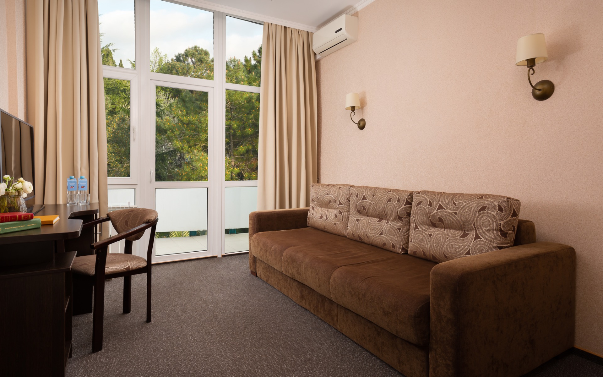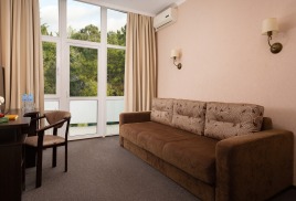 - Семейный 2-х комнатный комофрт: Вид на море. Вид на парк. Номер площадью 35м² (без площади балкона) с капитальным ремонтом 2012 года. Состоит из гостиной, спальни и ванной комнаты. В гостиной находится мягкая мебель, ЖК телевизор, холодильник, телефон, шкаф, в спальне – двуспальная кровать 1,8 м, прикроватные тумбочки, письменный стол. Ванная комната оснащена ванной. На балкон можно попасть из спальни и из гостиной.