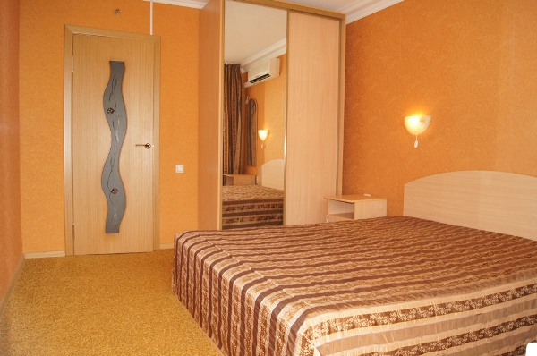 - Двухместные двухкомнатные номера "Делюкс" (площадью 25 кв. м). В номере: двуспальная кровать, ванная комната с ванной, телевизор, холодильник, телефон, Сплит-система, мягкая мебель (раскладывающийся диван), лоджия с видом на море. Максимальное размещение – 4 человека.Все номера с боковым видом на море, имеют лоджию с раскладными деревянными шезлонгами.