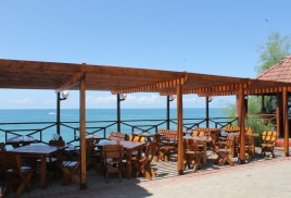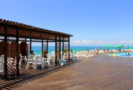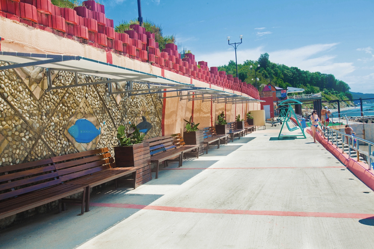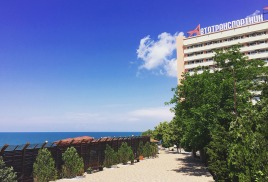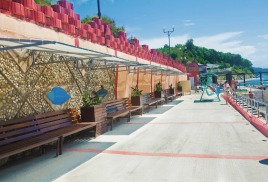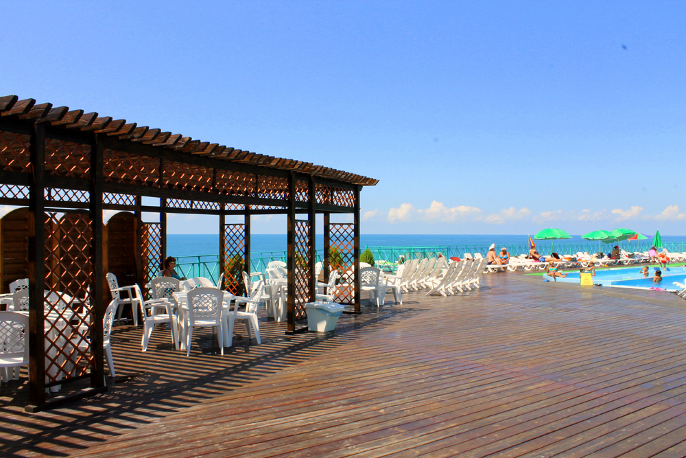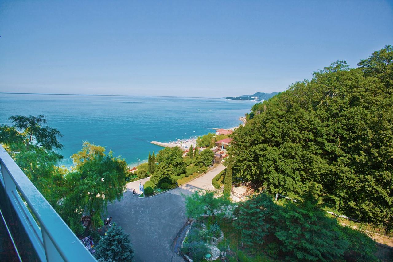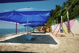 Пляж: Собственный пляж в 40 м. от корпуса, закрытый с двух сторон - с одной стороны естественным горным массивом (скалой), с другой стороны – насыпным камнем (молом) и разделён на 3 зоны: галечный, мелко-галечный (2800 кв. м) и пляж с искусственным покрытием «Зеленая трава –( 600 кв.м.).