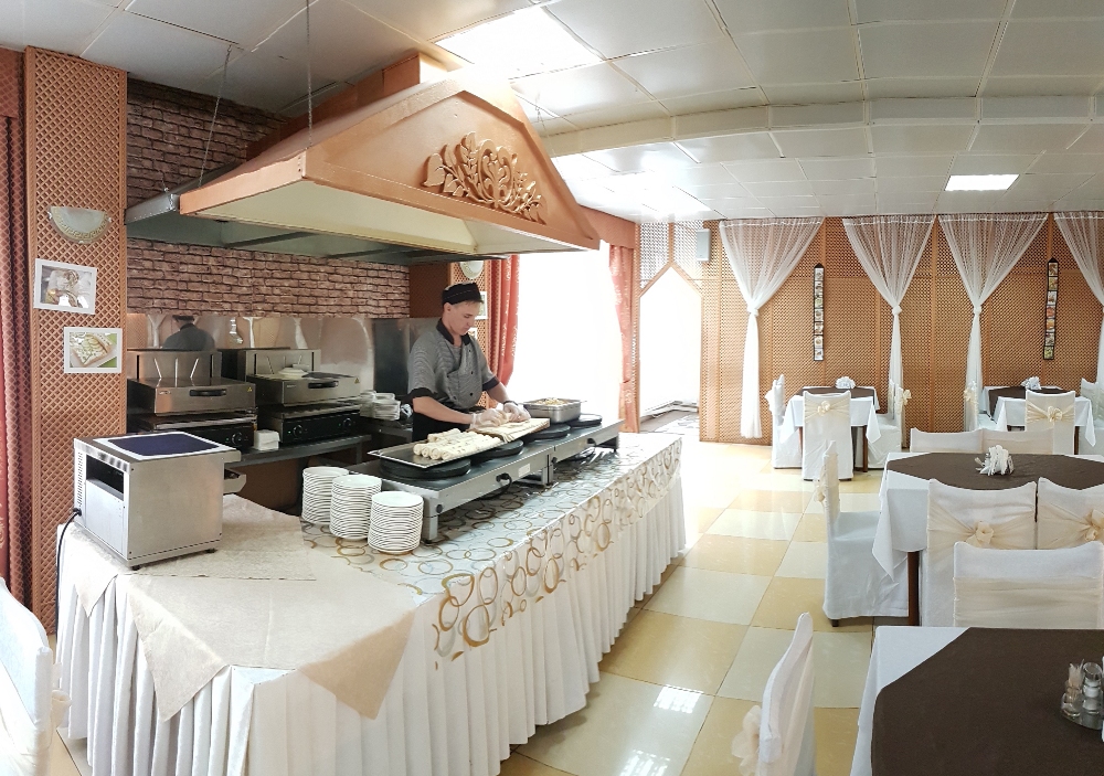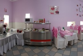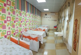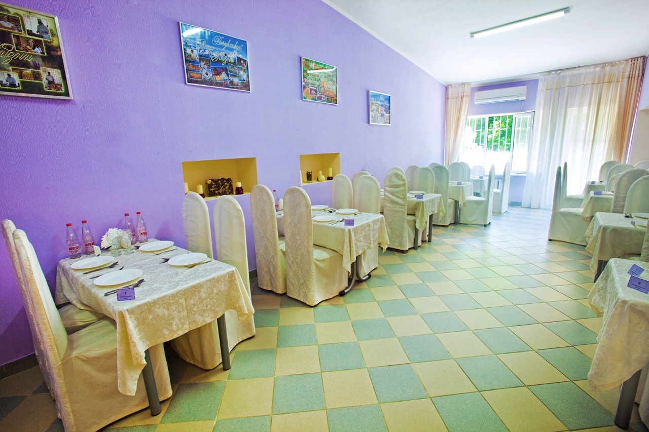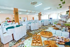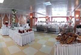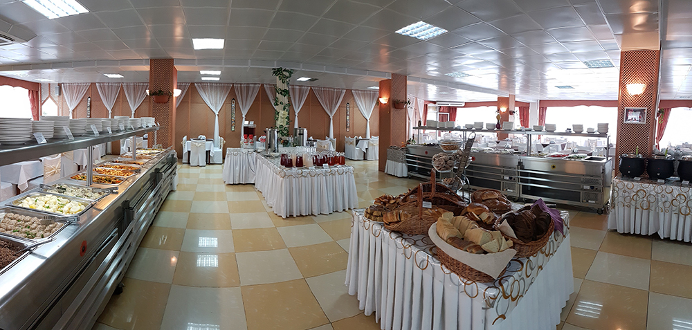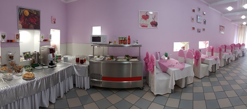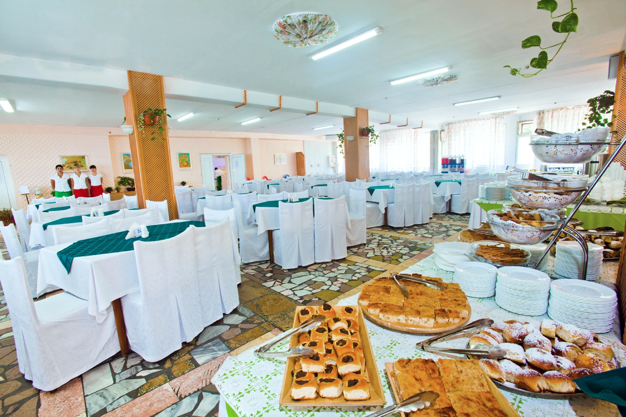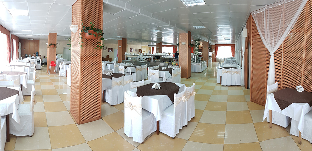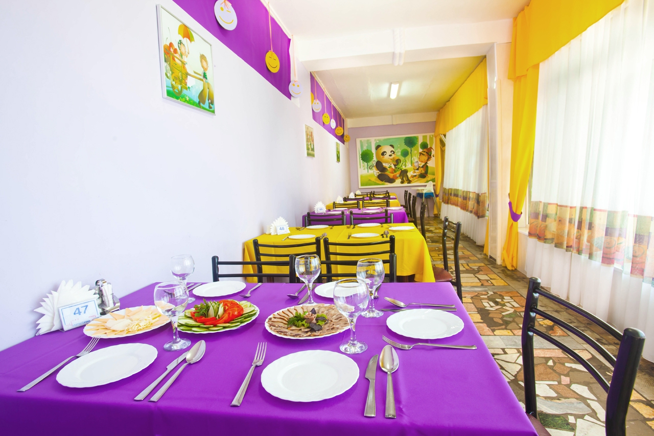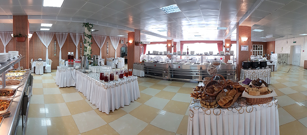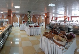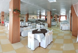 - столовая располагается на 2-м этаже 12-ти этажного спального корпуса санатория и состоит из трех оснащенных современным оборудованием и системой кондиционирования обеденных залов: общий, VIP-зал, и детский (специально оборудованный зал с приставными стульчиками для приема пищи гостей с детьми до 3-х лет и выше), общей вместимостью на 200 мест в смену.