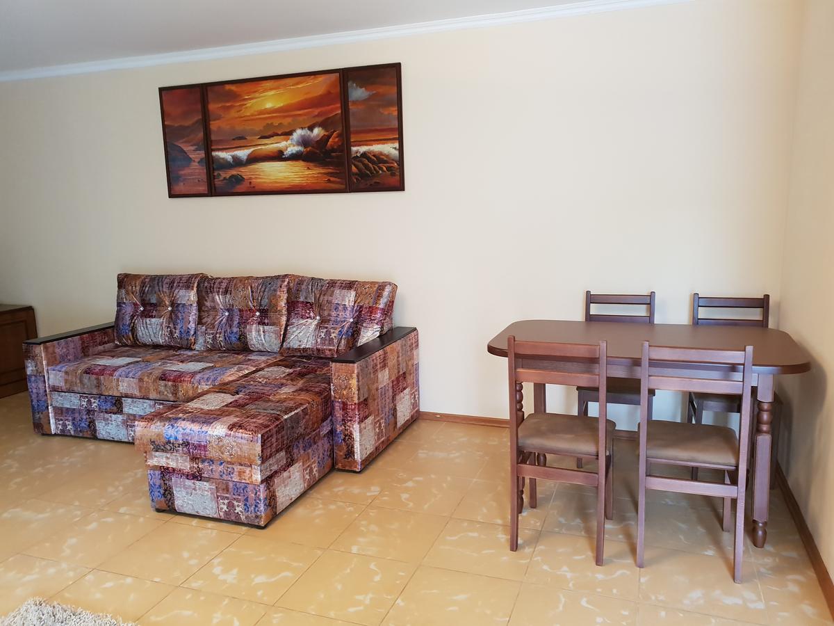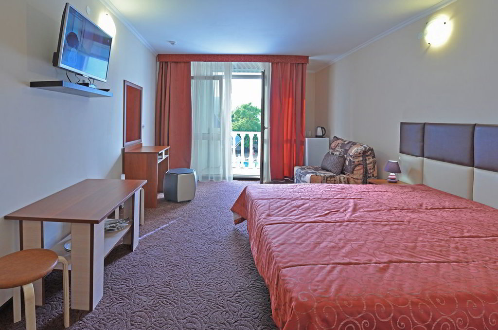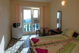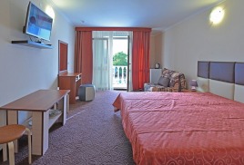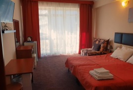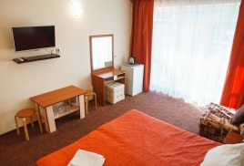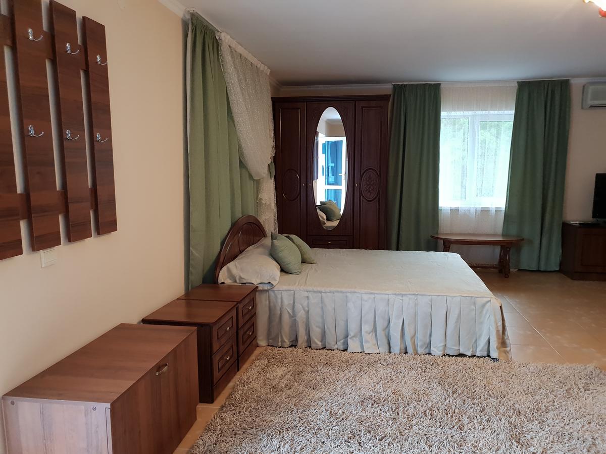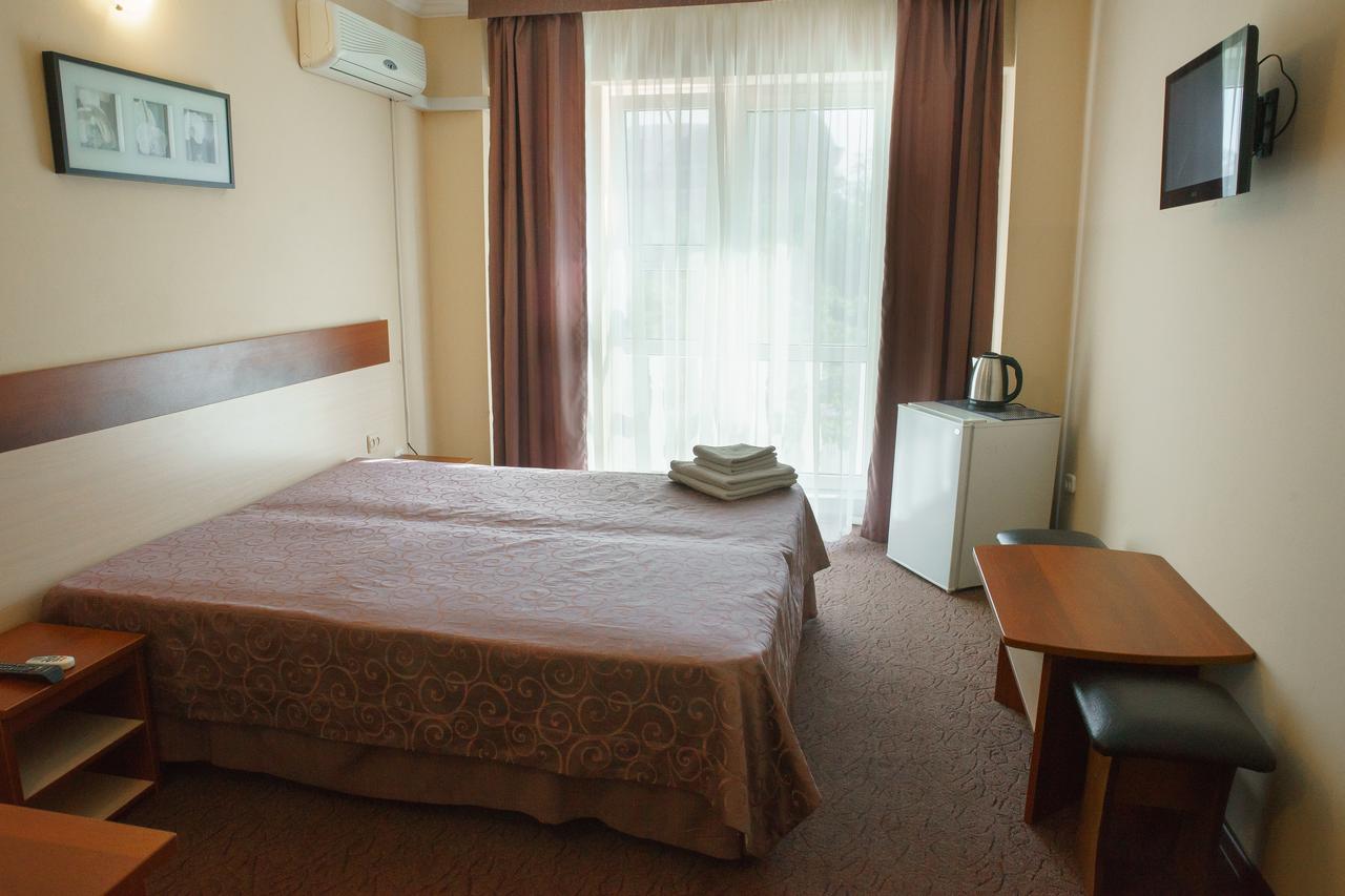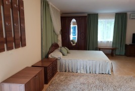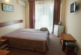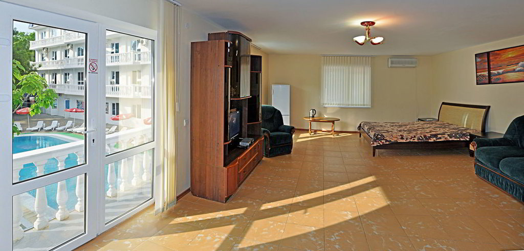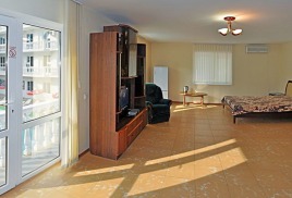 Площадь 40 кв. м. В номере: большая двухспальная кровать, кресло, диван, ТВ, холодильник, сплит система, шкаф с посудой, санузел с душевой кабинкой.