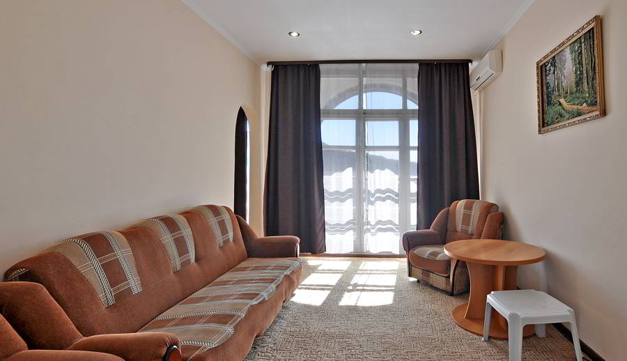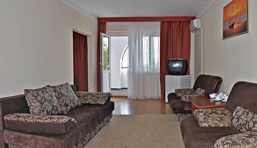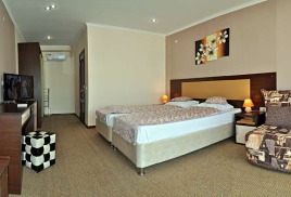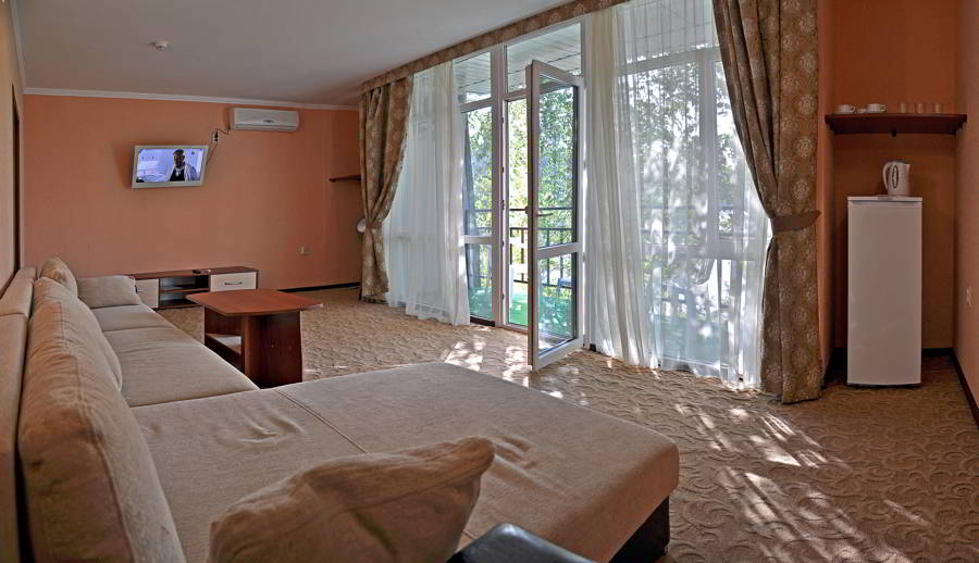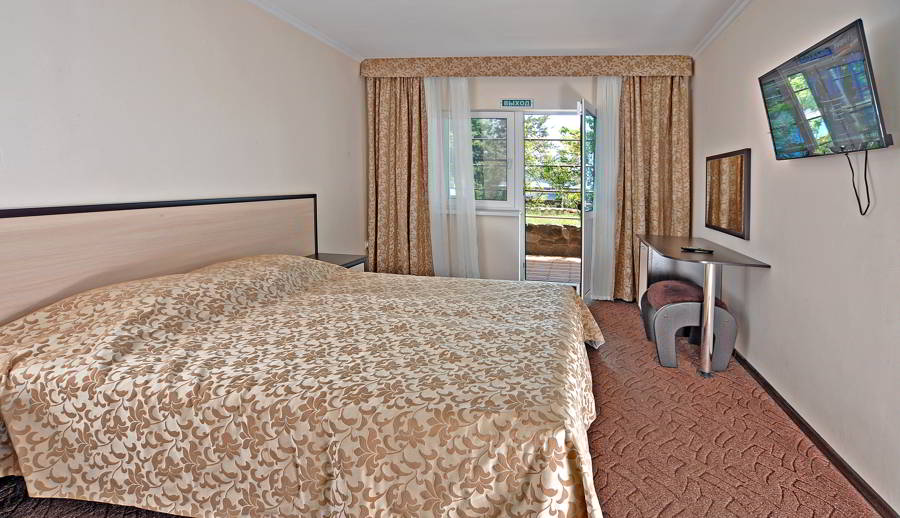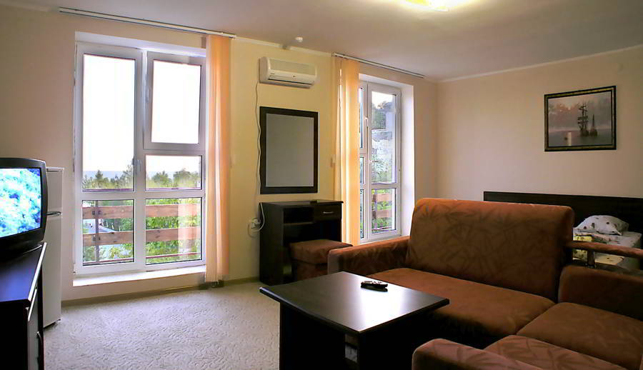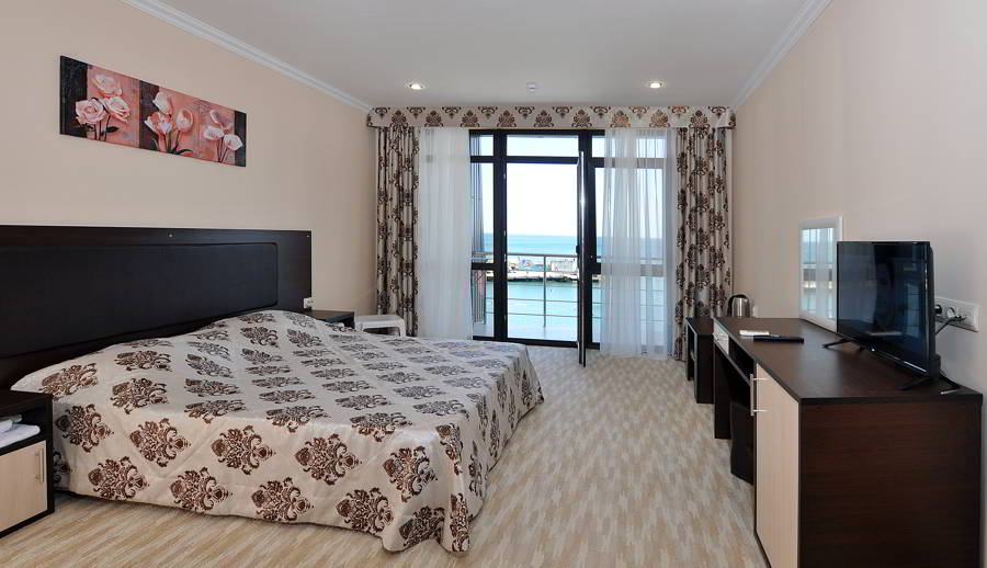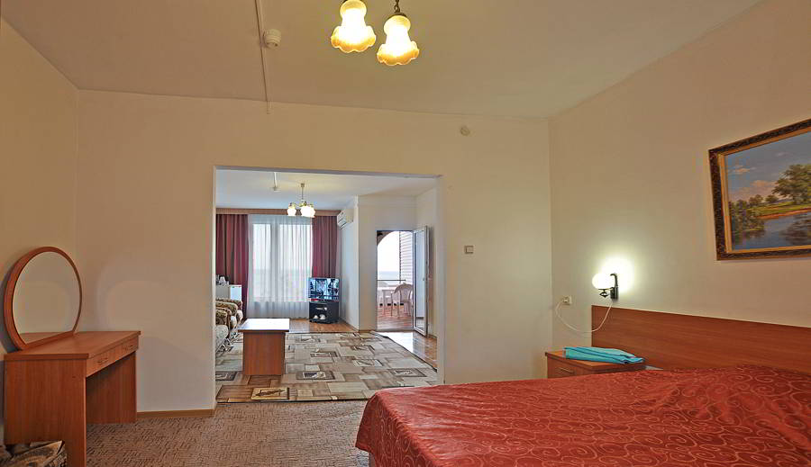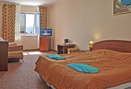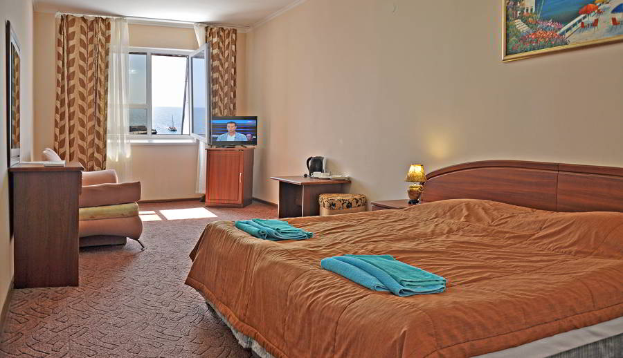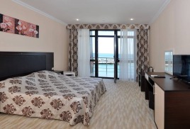 - 2-х местный номер Полулюкс с удобствами с видом на море (42м2) (макс.2+2). В номере: две кровати бокс-спринг, диван, душ, санузел, сплит-система, балкон, ТВ, Х,Wi-Fi. Дополнительное место: раскладной диван.