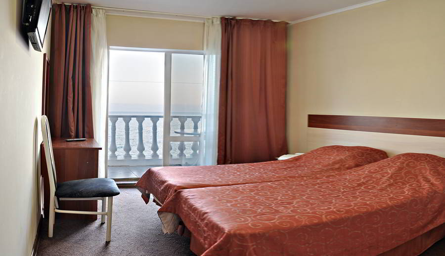- 2-х местный 1,5 комнатный номер с удобствами с видом на море (25м2) (макс.2+2). В номере: 1,5 комнаты, разделенные аркой , две кровати бокс-спринг, мини-диван, душ, санузел, сплит-система, балкон, ТВ, Х, Wi-Fi. Дополнительное место: мини-диван. Второе доп. место по запросу.