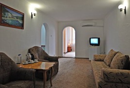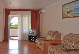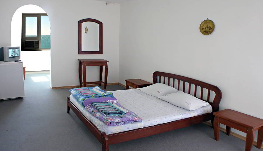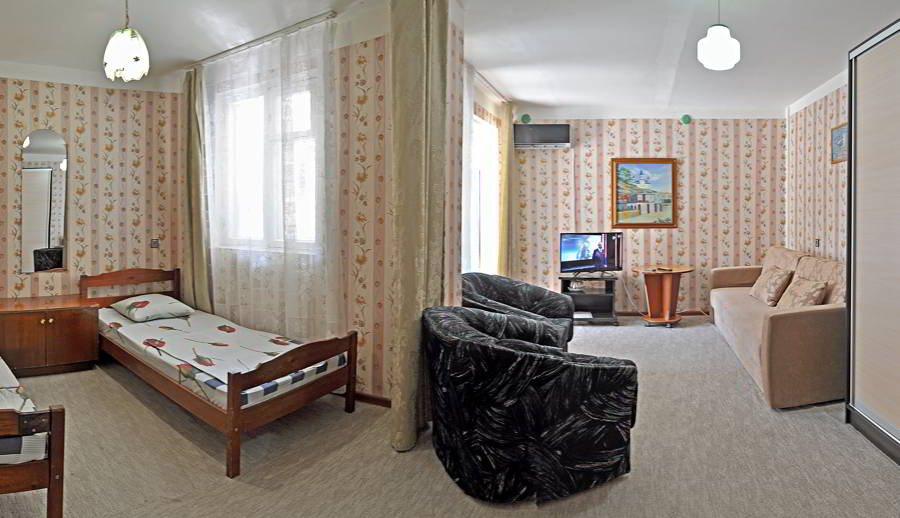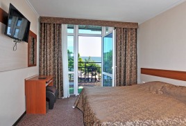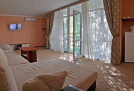 - 2-х местный 1,5 комнатный номер с удобствами (24м2) с видом на море (макс.2+1). В номере: 1,5 комнаты, разделенные аркой , две кровати бокс-спринг, мини-диван, душ, санузел, сплит-система,ТВ,Х, Wi-Fi.В номерах – собственная терраса, оборудованная столиком, стульями, сушилкой для купальных принадлежностей. Дополнительное место: мини-диван. Второе доп. место по запросу.